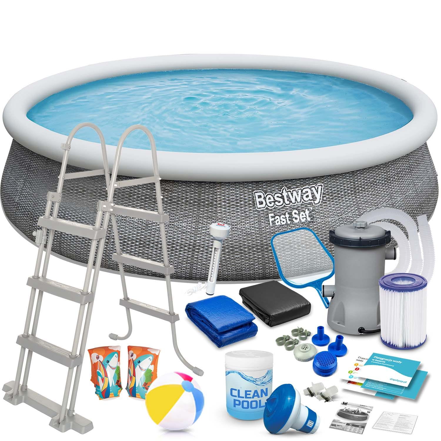 Basen ogrodowy rozporowy, 18w1, Bestway, 457x107 cm. Jeśli potrzebujesz dużego, niezawodnego basenu, w którym będziesz mógł swobodnie pływać - to idealny wybór dla Ciebie! Gotowy zestaw z kompletnym wyposażeniem – nie musisz sam szukać wszystkich elementów.