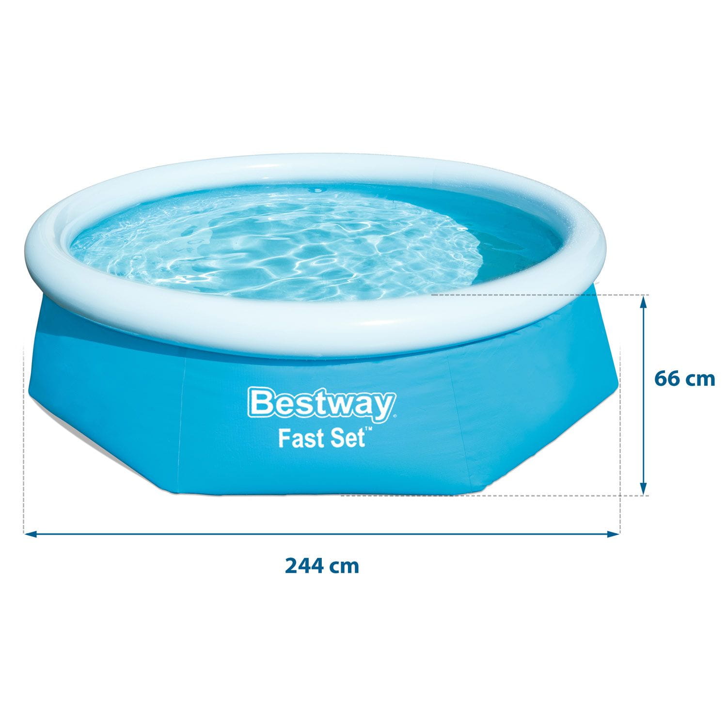 Basen ogrodowy rozporowy, zestaw 9w1, Bestway, 244x66 cm. Basen utrzymuje stabilność dzięki sile rozporowej wody oraz dzięki dmuchanemu pierścieniowi przez co jest bardzo bezpieczny dla dzieci. Basen bardzo szybko stanie się on wspaniałym miejscem Twojego letniego wypoczynku i centrum dziecięcej zabawy.