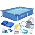Basen prostokątny stelażowy, 16w1, Bestway, 221x150x43 cm. Idealny do ochłody w upalne dni letnie dni! Solidny basen, który błyskawicznie będzie gotowy do użytku. Basen został specjalnie zaprojektowany, by stworzyć bezpieczne warunki do zabawy dla dzieci, które kochają wodę.