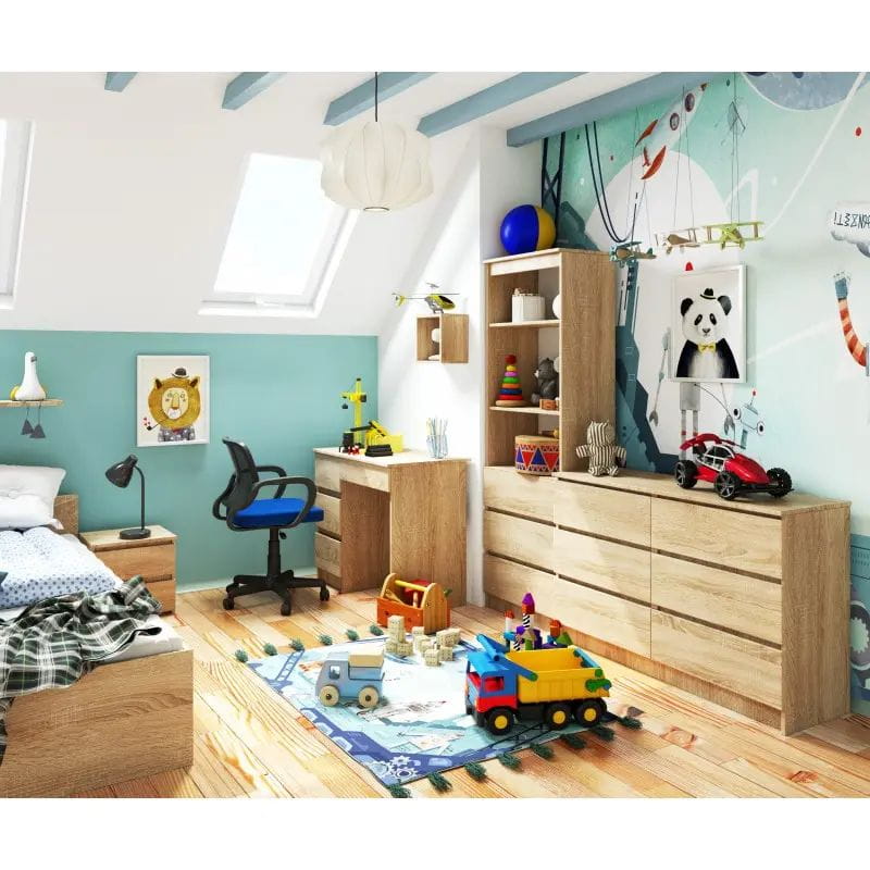 Biurko wyposażone zostało w cztery praktyczne szuflady, które sprawnie i cicho poruszają się na metalowych prowadnicach rolkowych, dzięki czemu bardzo łatwo się je otwiera i zamyka. Fronty szuflad prezentują się elegancko, ponieważ także zostały wykonane z płyty laminowanej. Umieszczone zostały one po lewej stronie, co jest praktycznym i funkcjonalnym rozwiązaniem. Szuflady te zapewniają dużą ilość przestrzeni do zagospodarowania, natomiast na blacie o długości 90 cm oraz szerokości 50 cm, z łatwością zmieści się laptop lub monitor komputera stacjonarnego, przybory do pisania oraz inne potrzebne do nauki przedmioty.