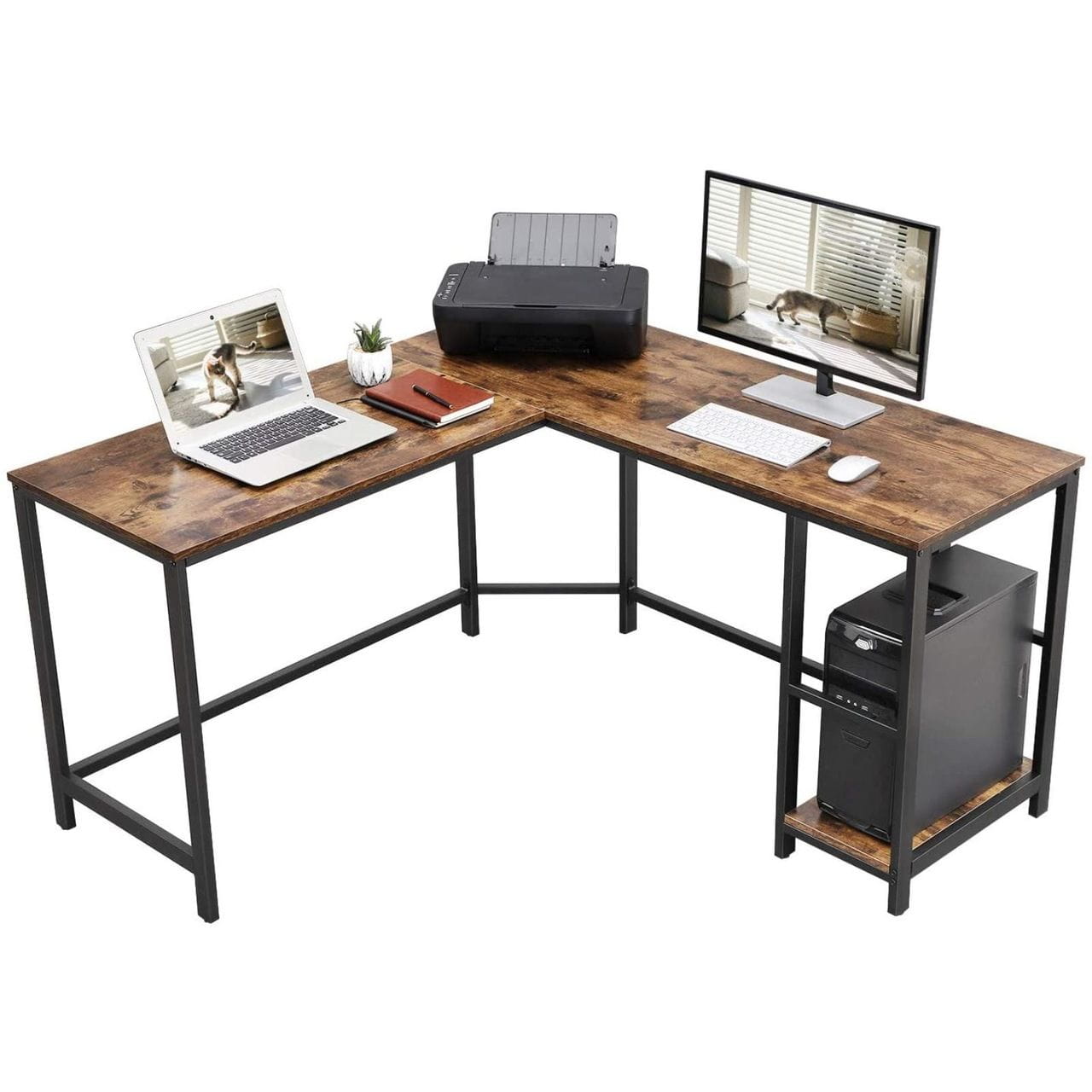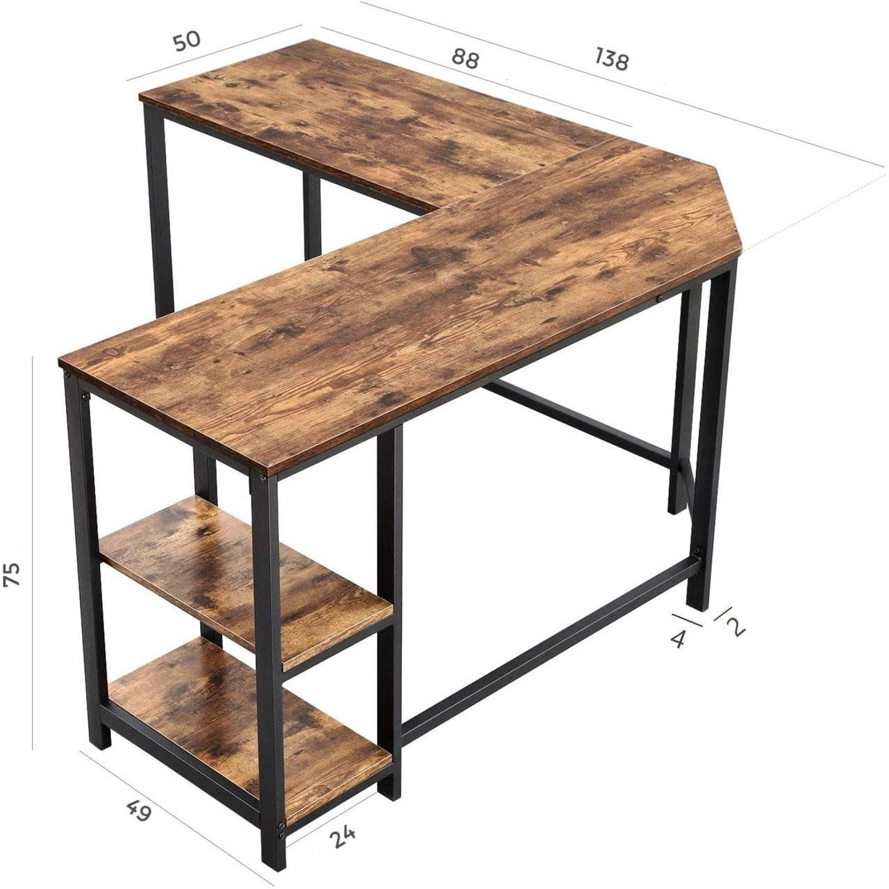 Biurko narożne, 2 półki, 138x138x75 cm, ciemny brąz, czarny, mat. Eleganckie i funkcjonalne biurko z dwoma wbudowanymi półkami i dużym blatem. Idealnie odnajdzie się w każdym pokoju, biurze czy innym pomieszczeniu, któremu doda efektu.
