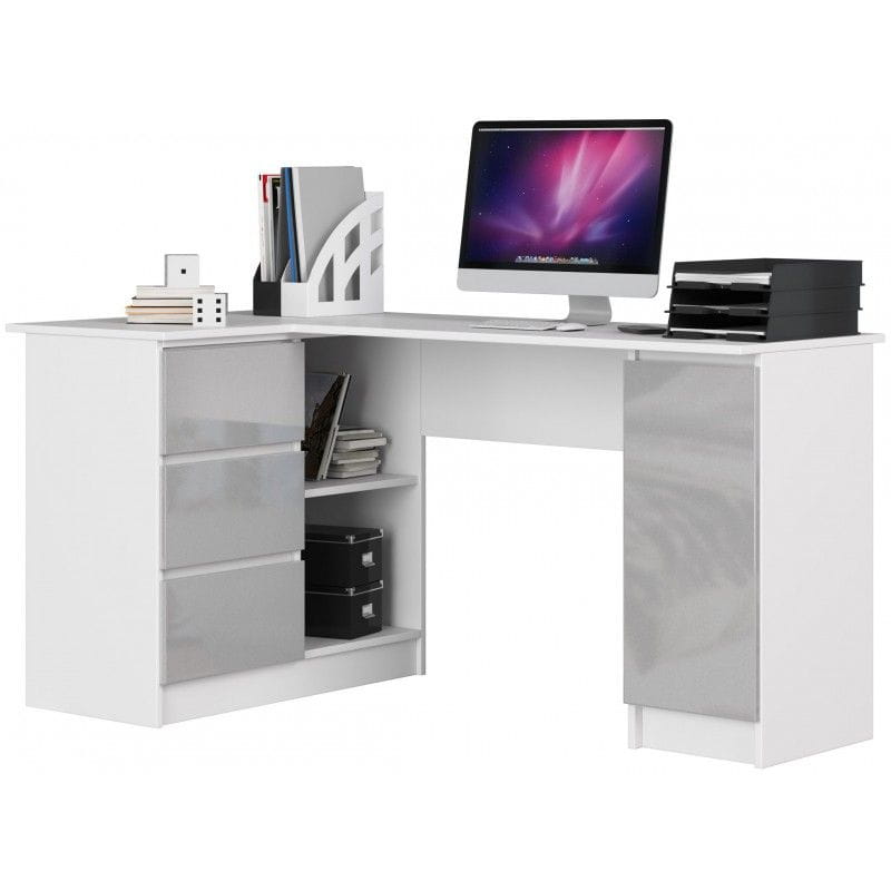 Biurko narożne, biurowe, lewe, 155 cm. Lewostronne biurko narożne to ciekawe rozwiązanie dla wielu osób uczących się i pracujących przed ekranem komputera. Mebel ma wymiary 155 cm długości, 77 cm wysokości i 85 cm głębokości. Materiał, z którego został wykonany to wysokiej jakości płyta laminowana, która cechuje się wysoką odpornością na ścieranie. Z kolei krawędzie biurka posiadają obrzeże ABS, dzięki czemu nie dają się łatwo uszkodzeniom. Mebel posiada trzy szuflady ( przesuwające się dzięki metalowym prowadnicom rolkowym ), a także półki. Można w nich przechowywać artykuły biurowe, dokumenty, segregatory a nawet urządzenie elektroniczne.