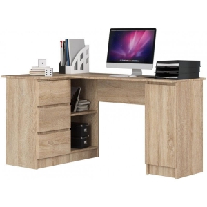 Biurko narożne, biurowe, lewe, 155 cm. Lewostronne biurko narożne to ciekawe rozwiązanie dla wielu osób uczących się i pracujących przed ekranem komputera. Mebel ma wymiary 155 cm długości, 77 cm wysokości i 85 cm głębokości. Materiał, z którego został wykonany to wysokiej jakości płyta laminowana, która cechuje się wysoką odpornością na ścieranie. Z kolei krawędzie biurka posiadają obrzeże ABS, dzięki czemu nie dają się łatwo uszkodzeniom. Mebel posiada trzy szuflady ( przesuwające się dzięki metalowym prowadnicom rolkowym ), a także półki. Można w nich przechowywać artykuły biurowe, dokumenty, segregatory a nawet urządzenie elektroniczne.