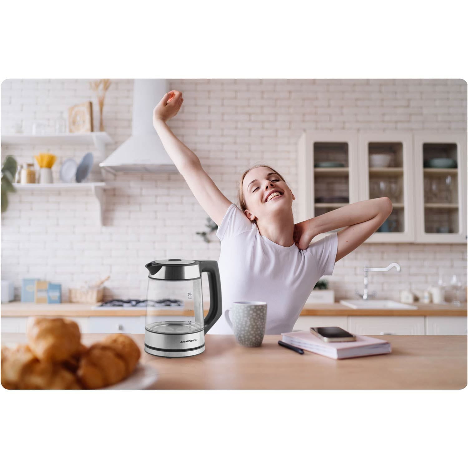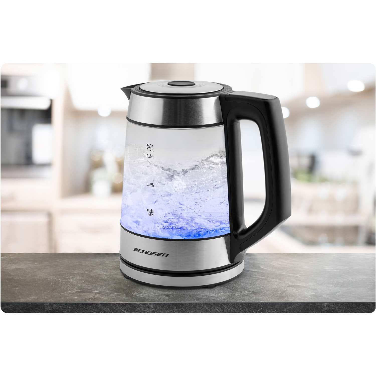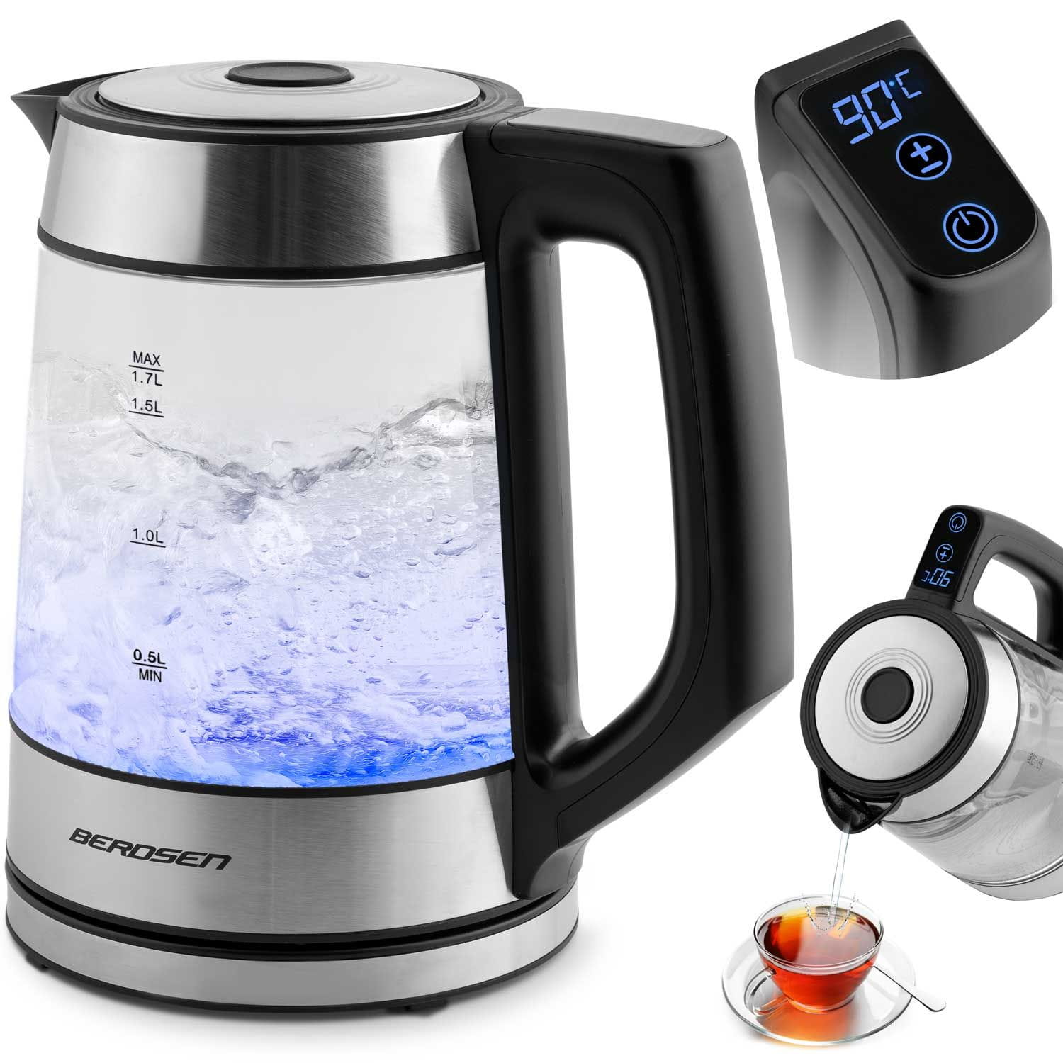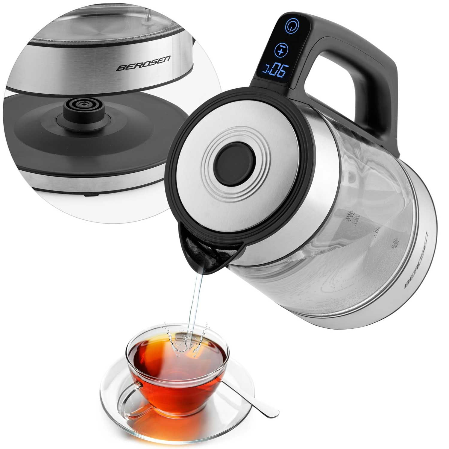 Czajnik elektryczny szklany, 1,7L, Berdsen, czarny, srebrny.