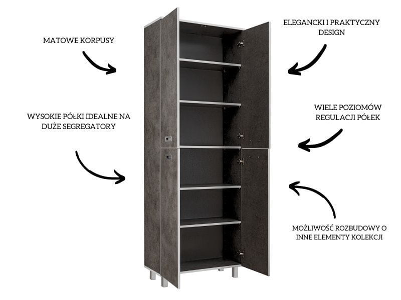 Duża szafa do biura, pokoju, Tim, 80x38x220 cm, ciemnoszary, mat. Szafa z sześcioma półkami to praktyczny i funkcjonalny sprzęt do wyposażenia każdej przestrzeni.