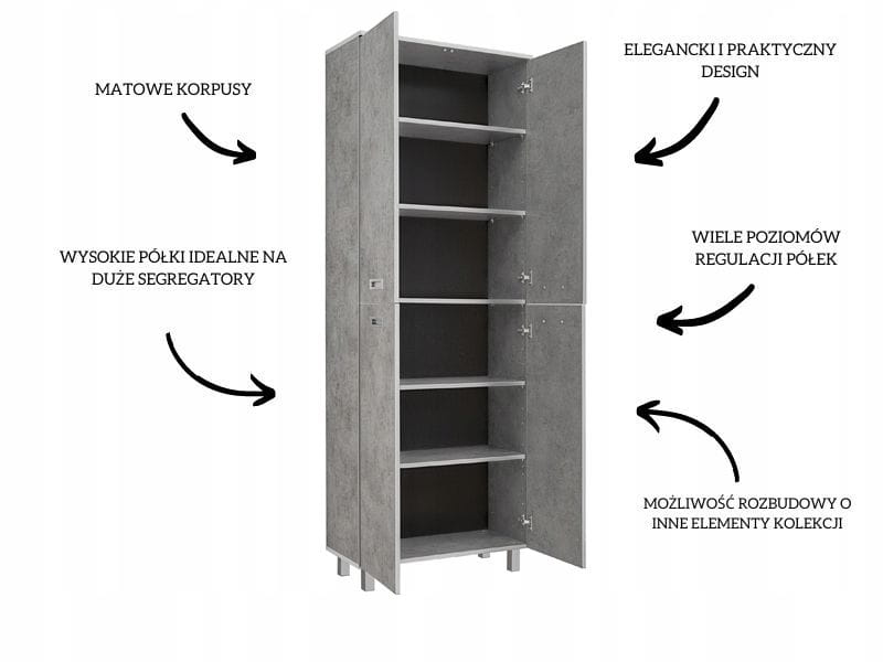Duża szafa do biura, pokoju, Tim, 80x38x220 cm, jasnoszary, mat. Szafa z sześcioma półkami to praktyczny i funkcjonalny sprzęt do wyposażenia każdej przestrzeni.