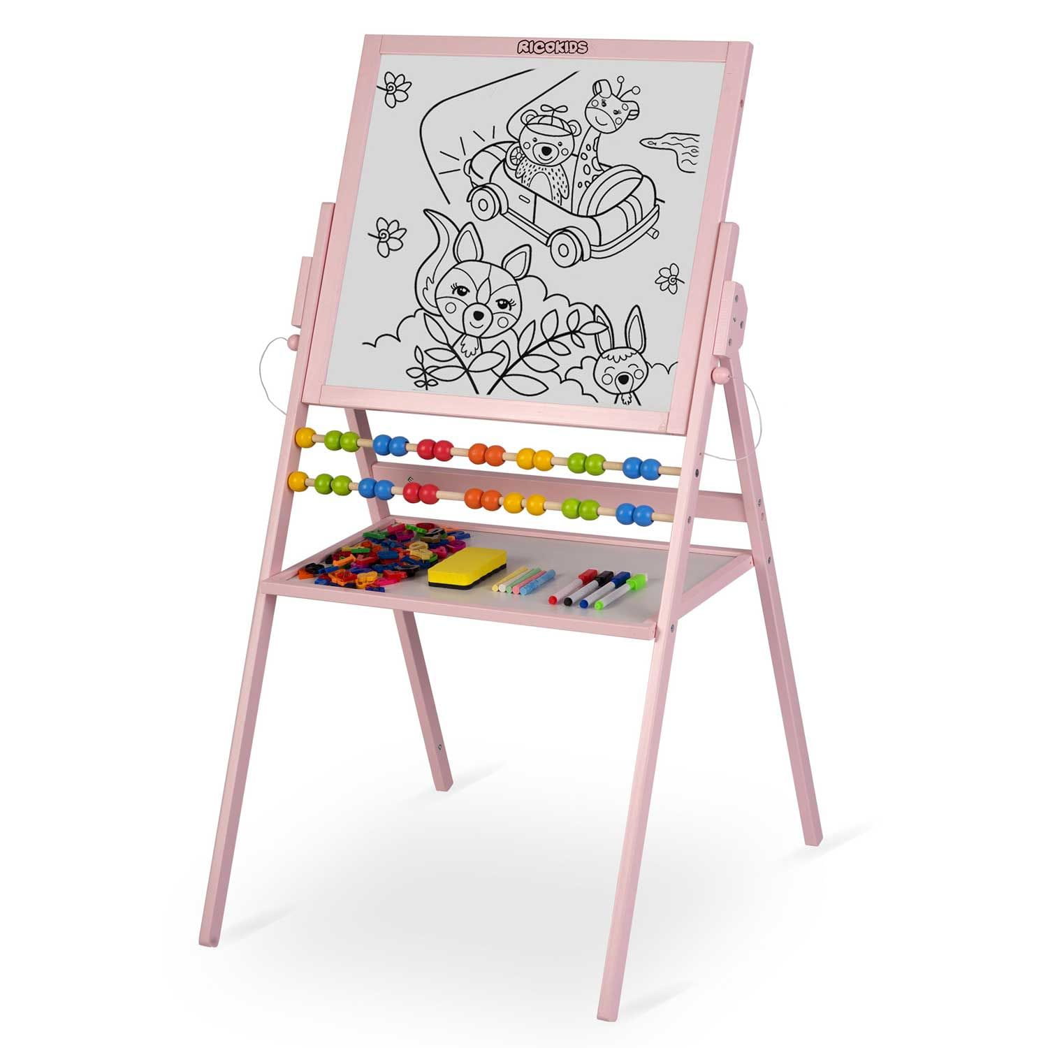 Duża tablica magnetyczna, kredowa, obrotowa, 101 cm. Spraw swojemu dziecku wyjątkową radość. Stabilna tablica do rysowania dla dzieci marki Ricokids, to spełnienie dziecięcych marzeń. Zestaw zawiera wszystkie najpotrzebniejsze rzeczy do nauki i zabawy.