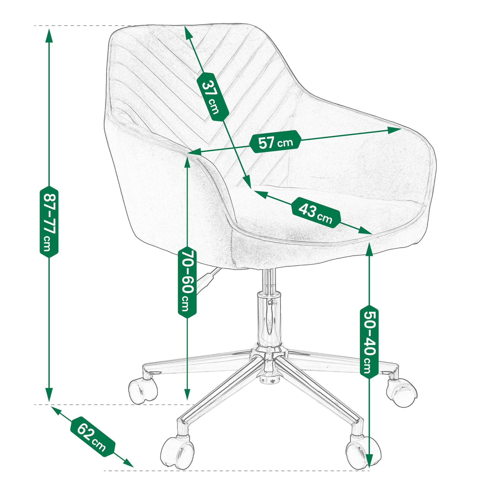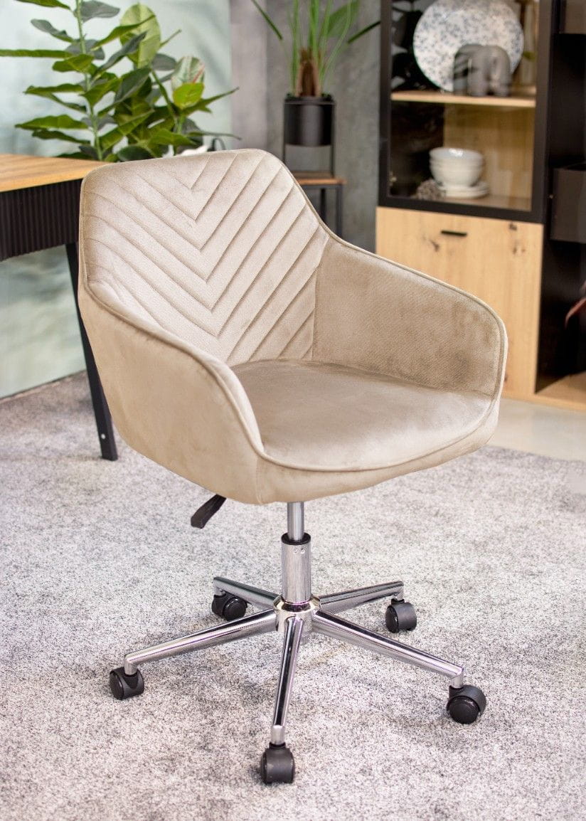 Elegancki fotel biurowy obity miękkim welurem, łączący nowoczesny design z wyjątkowym komfortem. Regulacja wysokości i 360-stopniowy obrót zapewniają wygodę podczas pracy. Solidna podstawa na pięciu kółkach gwarantuje stabilność i mobilność. Idealny do biur i domowych gabinetów, dodający przestrzeni stylu i klasy.