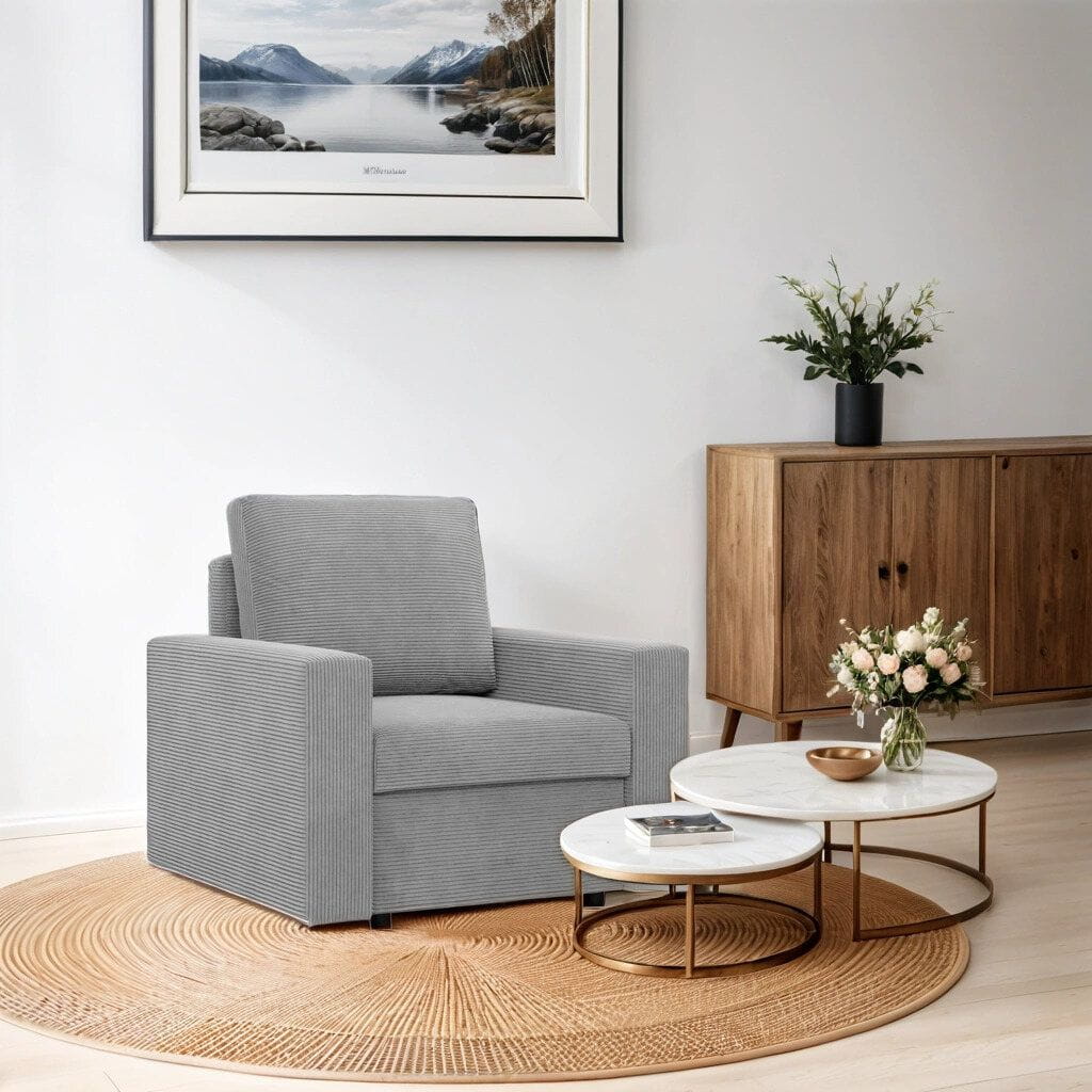 Fotel wypoczynkowy, prosty, BLOM, sztruks, 83x92x92 cm, jasny szary. Fotel BLOM to minimalistyczny, a zarazem bardzo wygodny mebel, który sprawdzi się w małometrażowych pomieszczeniach. Fotel wykończony został miękką i przyjemną tkaniną. Dodatkowym atutem mebla są wąskie podłokietniki, które nie zabierają zbyt dużej ilości miejsca.