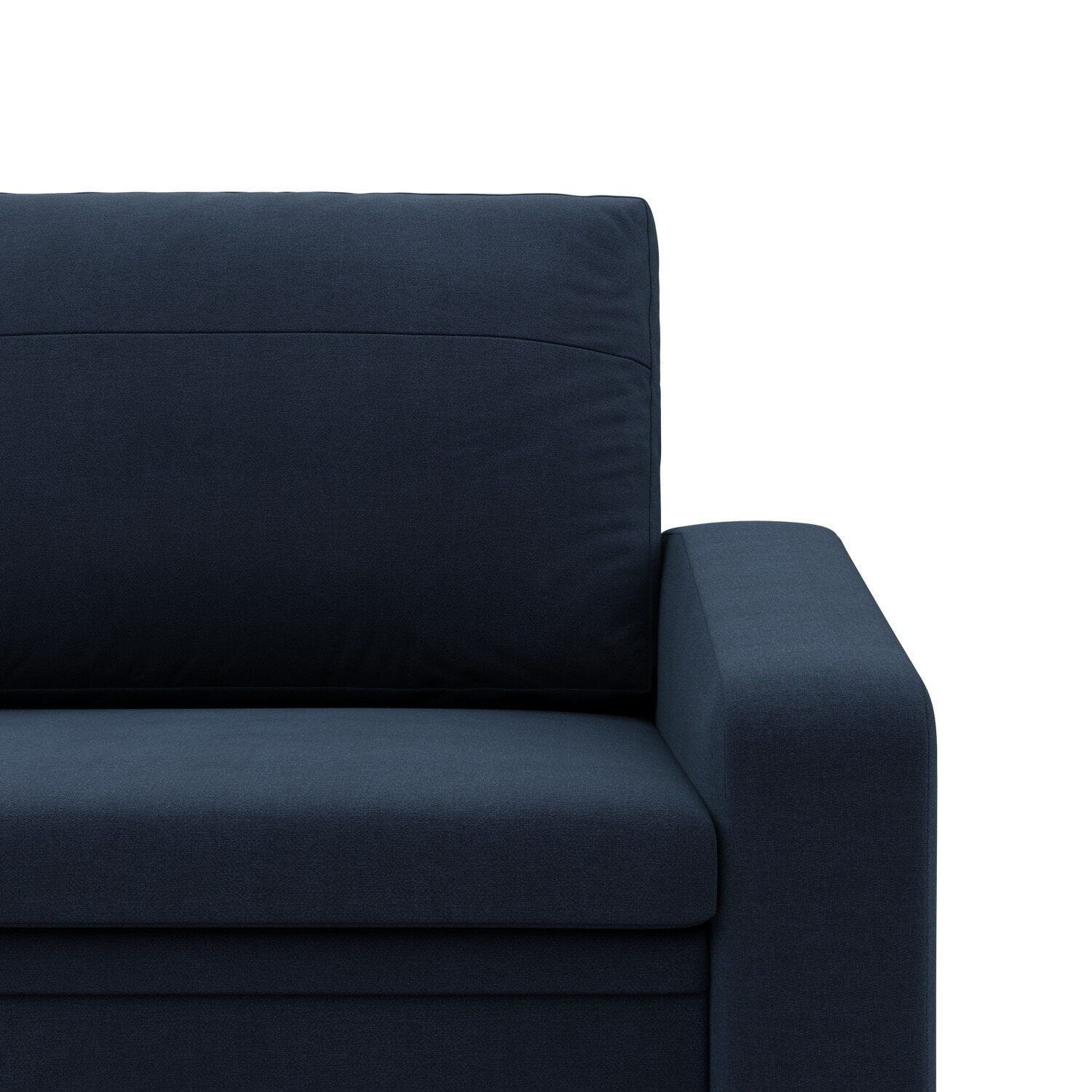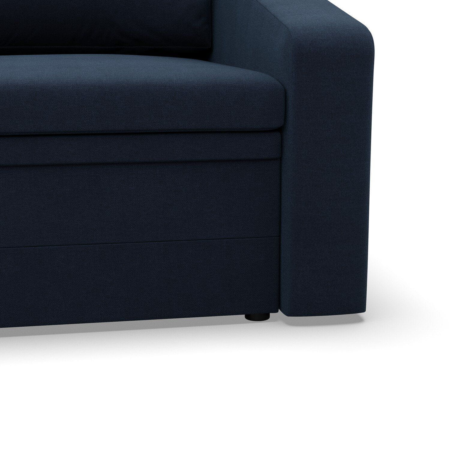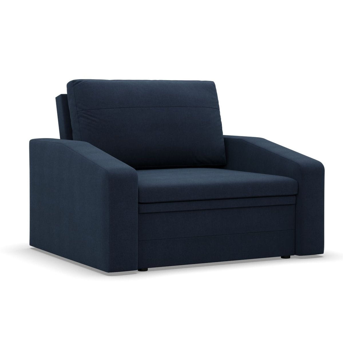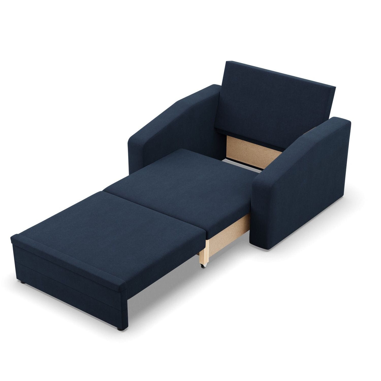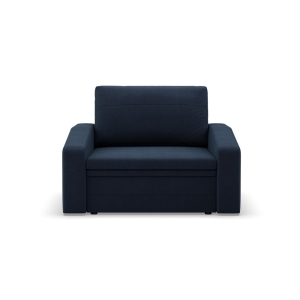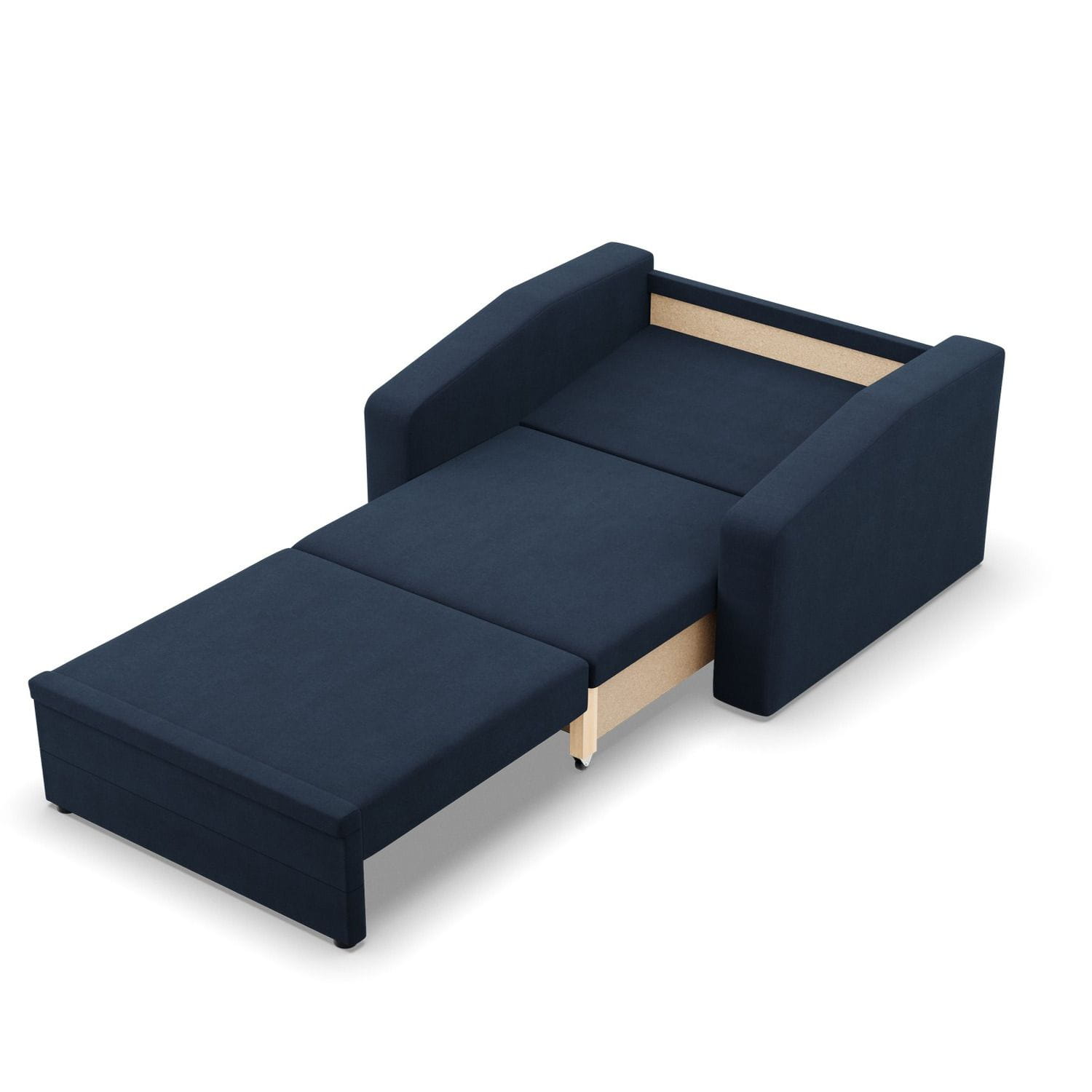 Fotel rozkładany, Punto, plecionka, 118x87x90 cm, granatowy. Fotel PUNTO to minimalistyczny, a zarazem bardzo wygodny mebel, który sprawdzi się w małometrażowych pomieszczeniach. Fotel wykończony został miękką i przyjemną tkaniną. Dodatkowym atutem mebla są wąskie podłokietniki, które nie zabierają zbyt dużej ilości miejsca.