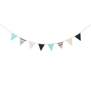 Girlanda, wykonana z delikatnych, starannie dobranej kolorystyki materiałów, emanuje subtelnym urokiem i elegancją. Składa się z różnorodnych elementów jak sznurek o długości 245cm i proporczyka o wysokości 18cm. Wspólnie tworząc piękny zestaw, który doskonale komponuje się z różnymi stylami wnętrz.