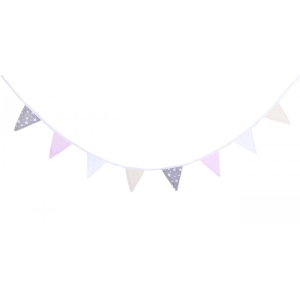 Girlanda, wykonana z delikatnych, starannie dobranej kolorystyki materiałów, emanuje subtelnym urokiem i elegancją. Składa się z różnorodnych elementów jak sznurek o długości 245cm i proporczyka o wysokości 18cm. Wspólnie tworząc piękny zestaw, który doskonale komponuje się z różnymi stylami wnętrz.