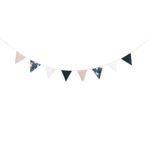 Girlanda, wykonana z delikatnych, starannie dobranej kolorystyki materiałów, emanuje subtelnym urokiem i elegancją. Składa się z różnorodnych elementów jak sznurek o długości 245cm i proporczyka o wysokości 18cm. Wspólnie tworząc piękny zestaw, który doskonale komponuje się z różnymi stylami wnętrz.