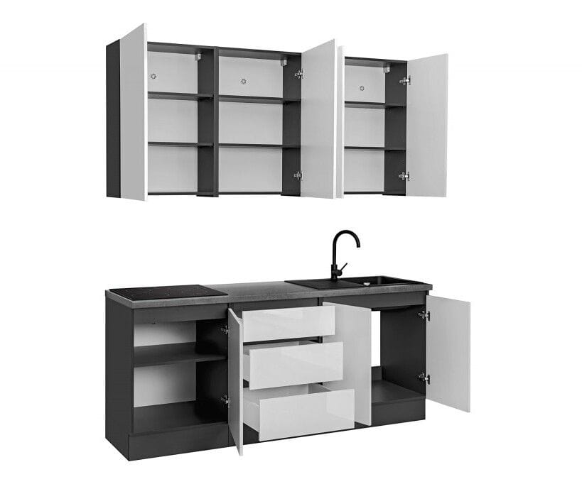 Gotowy zestaw mebli kuchennych, Dalia, biały, grafit, połysk. Funkcjonalny zestaw mebli kuchennych, który pozwala zagospodarować nawet najmniejszą przestrzeń. Trzy praktyczne szafki wiszące idealnie współgrają z trzema pojemnymi szafkami stojącymi, w których możesz umieścić wszystkie potrzebne elementy wyposażenia kuchni.