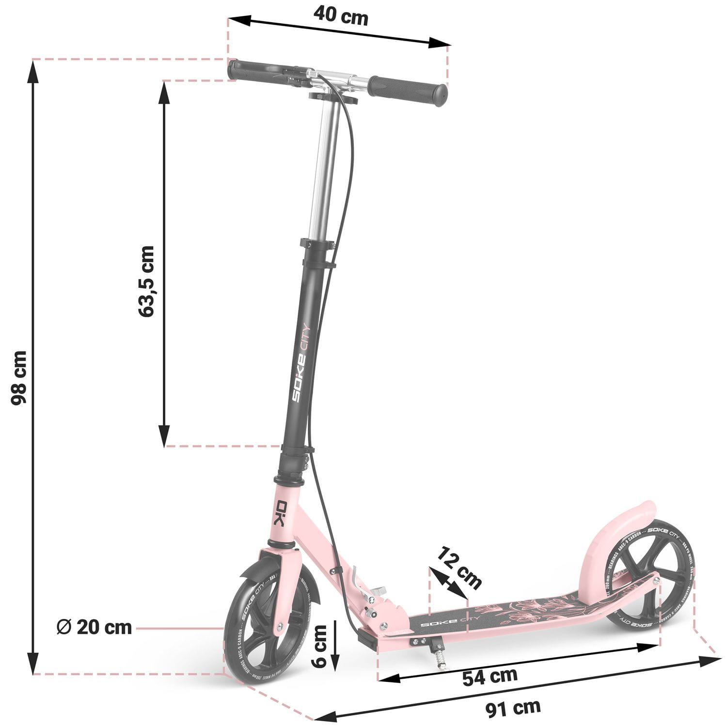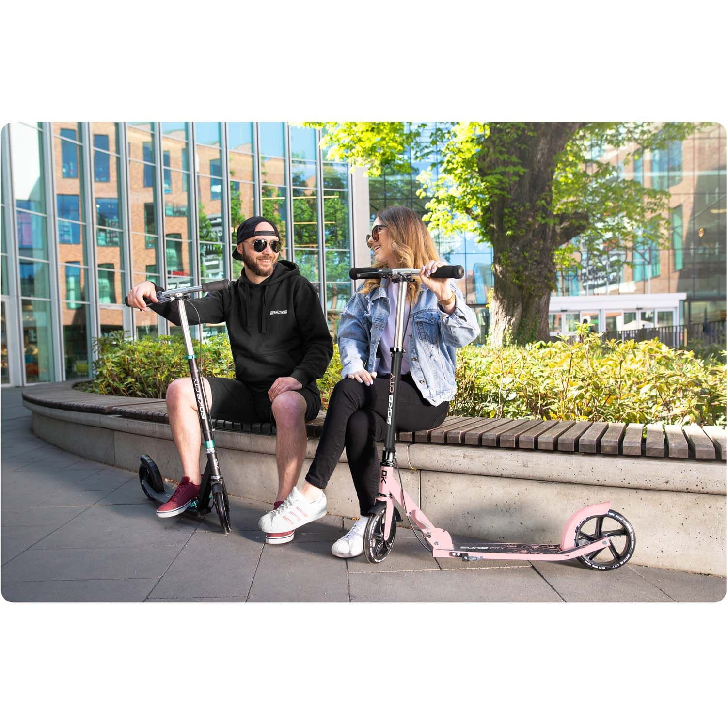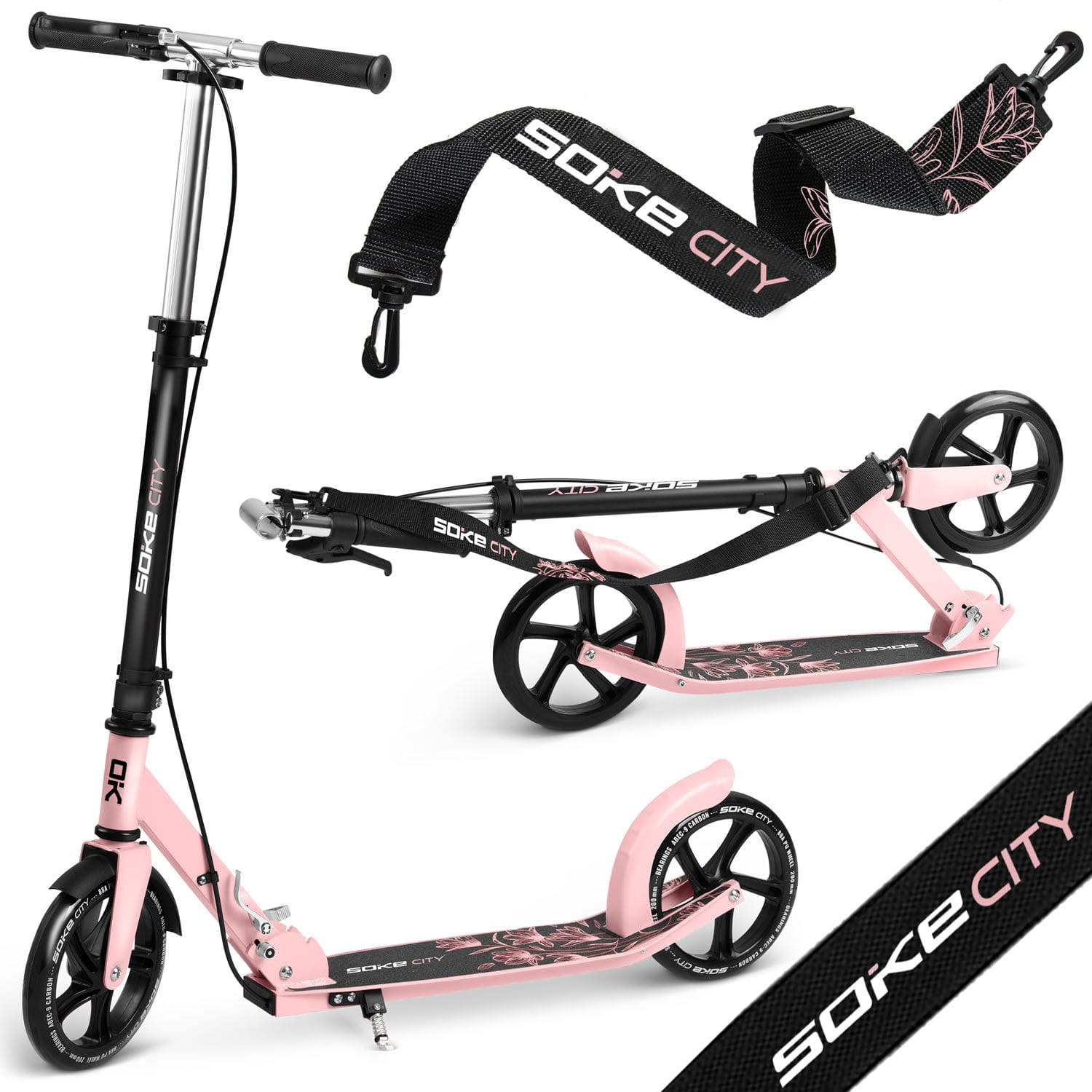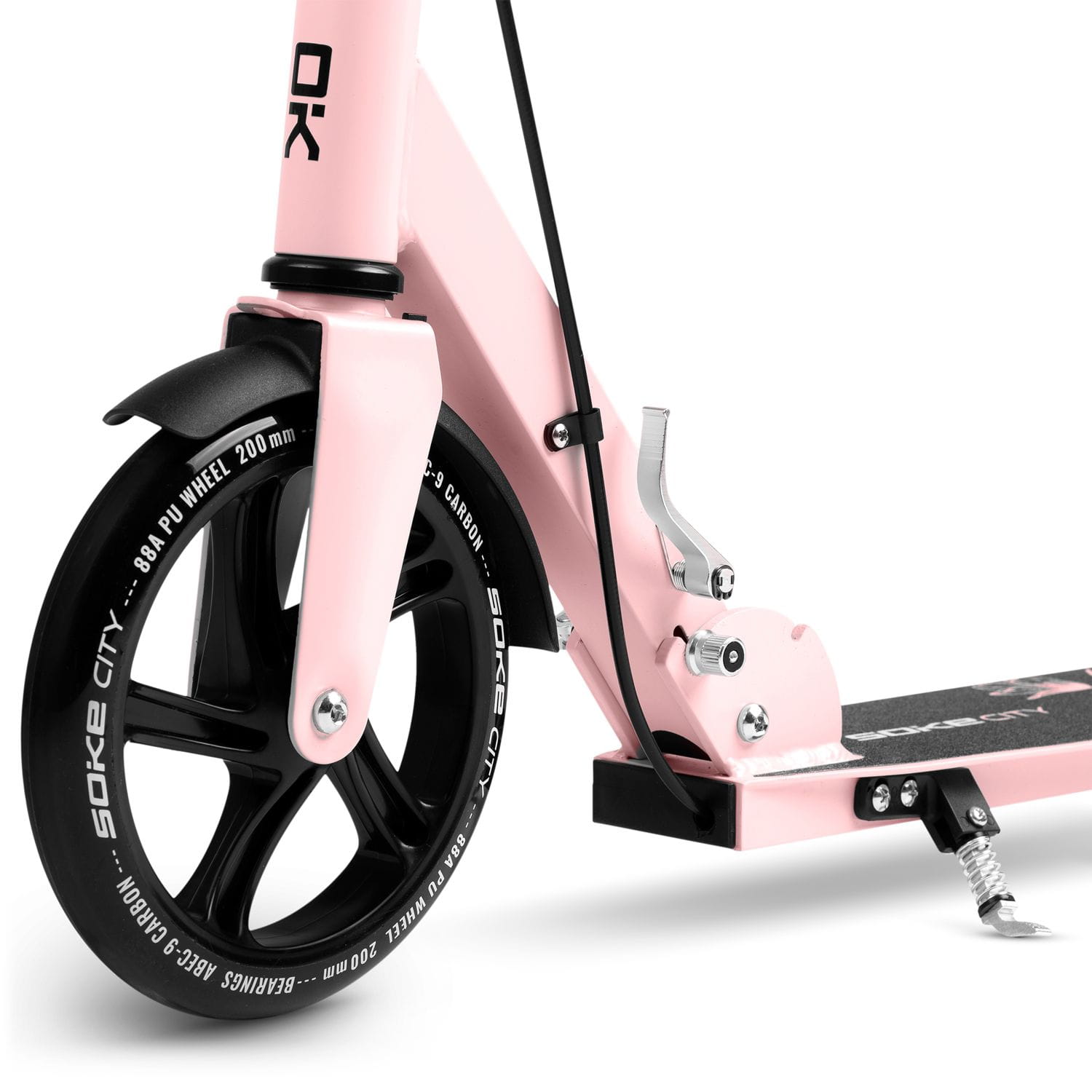 Hulajnoga dwukołowa, Soke City, czarno-różowa. Idealny środek transportu do pracy, szkoły i na uczelnie. Produkt pozwala na dostosowanie wysokości do własnych preferencji.