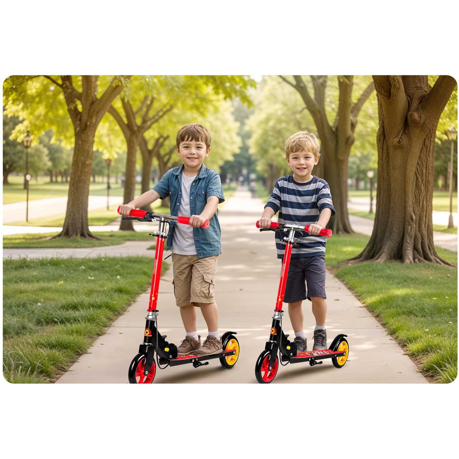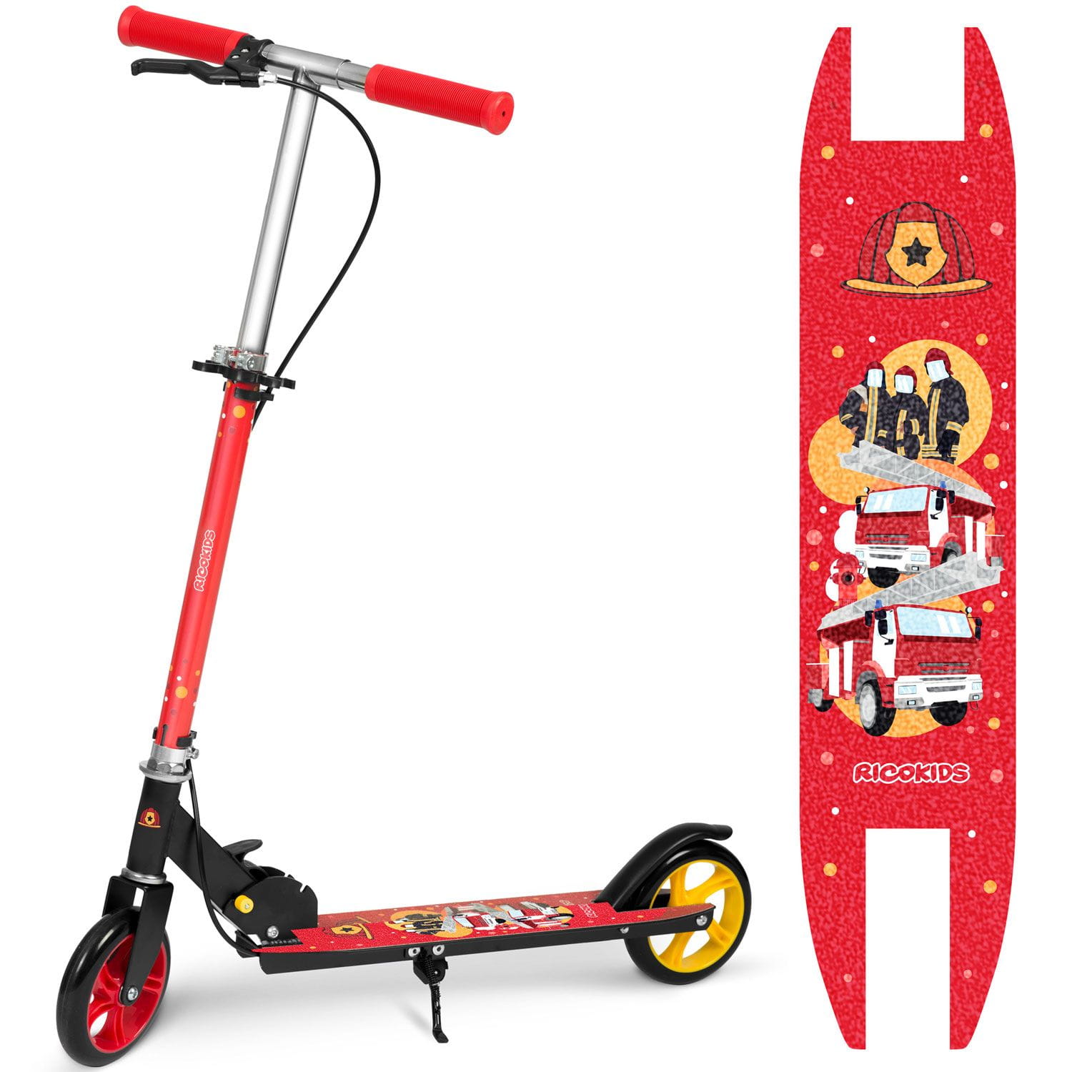 Hulajnoga dwukołowa, straż pożarna, Kodi, czerwona. Wybierając hulajnogę dla dziecka, postaw na bezpieczeństwo i komfort! Kółka o średnicy 145 mm to strzał w dziesiątkę dla maluchów od 3 do 8 lat. Niższy podest sprawia, że hulajnoga jest stabilniejsza, a jazda mniej męcząca. Podaruj swojemu dziecku radość i wygodę z hulajnogą dwukołową KODI!