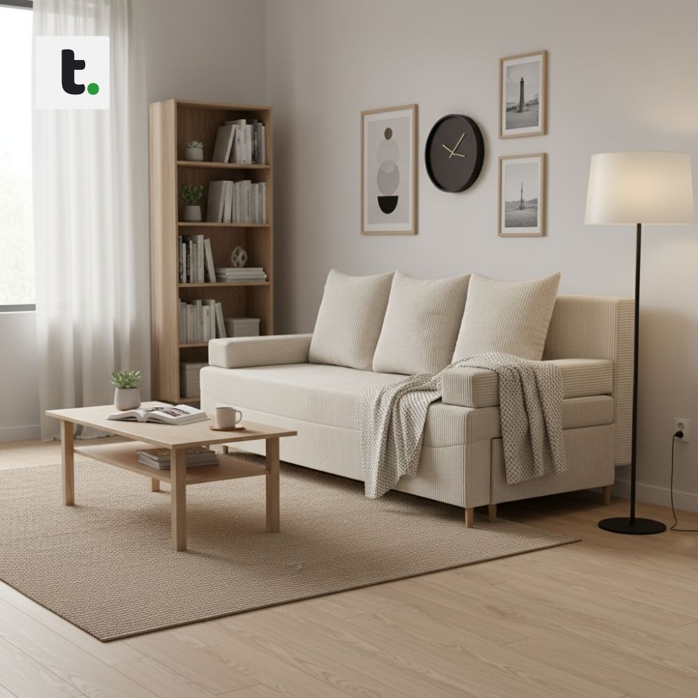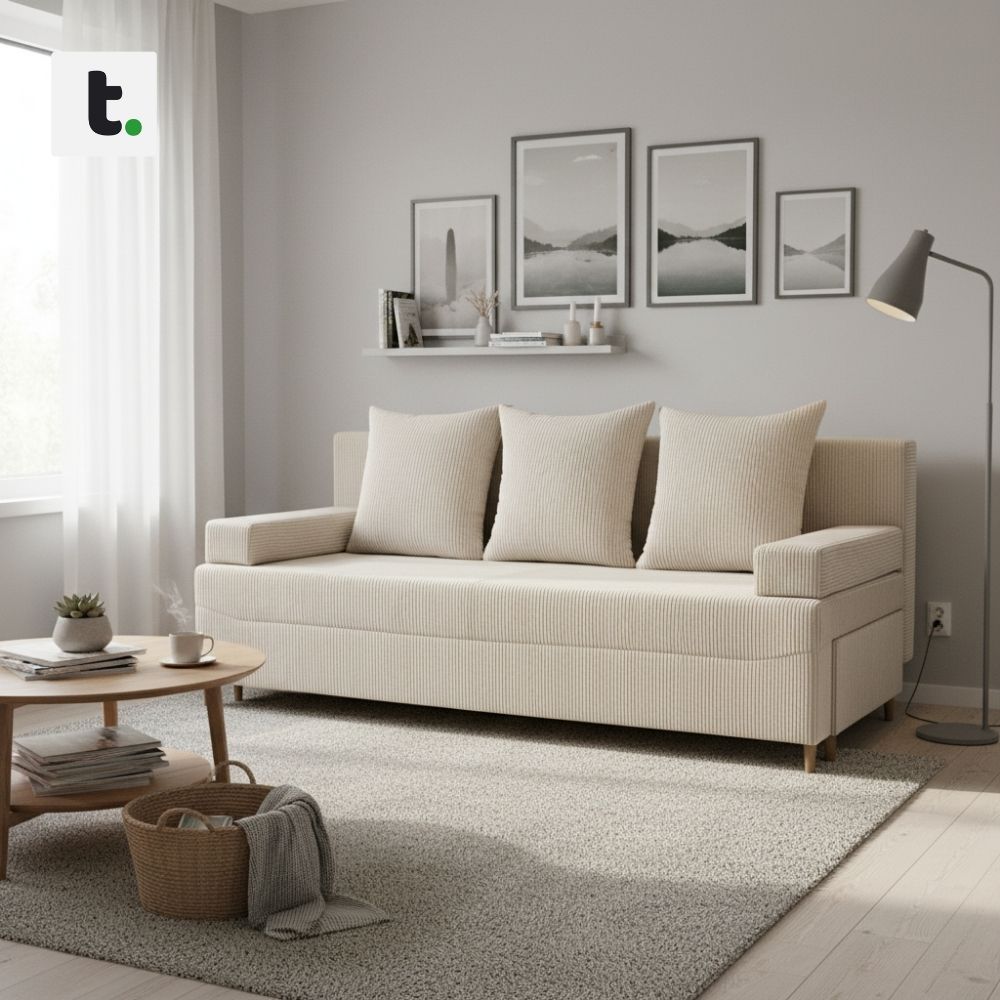 Kanapa rozkładana do salonu, sztruks, PANORA, 191x92x92 cm, beżowy. PANORA to zgrabny mebel, który zmieści się w każdym pomieszczeniu. Posiada też funkcję spania, dzięki czemu raz po raz może pełnić rolę łóżka, kiedy wpadną do Ciebie niezapowiedziani goście.