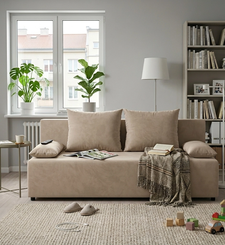 Kanapa została wyposażona w funkcję spania i praktyczny pojemnik do przechowywania, co szczególnie ważne jest w małych pomieszczeniach, aby zaoszczędzić miejsce. Dzięki solidnej konstrukcji i wysokiej jakości materiałów, mebel posłuży Ci przez wiele lat.