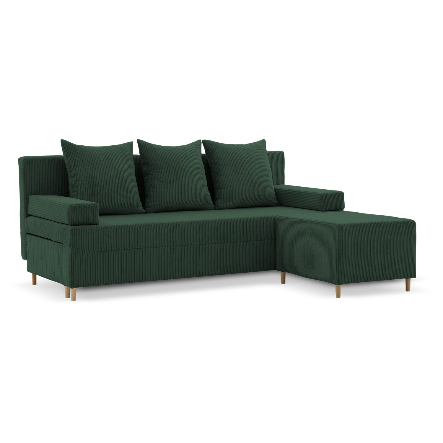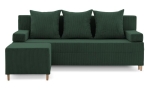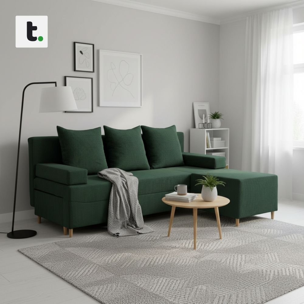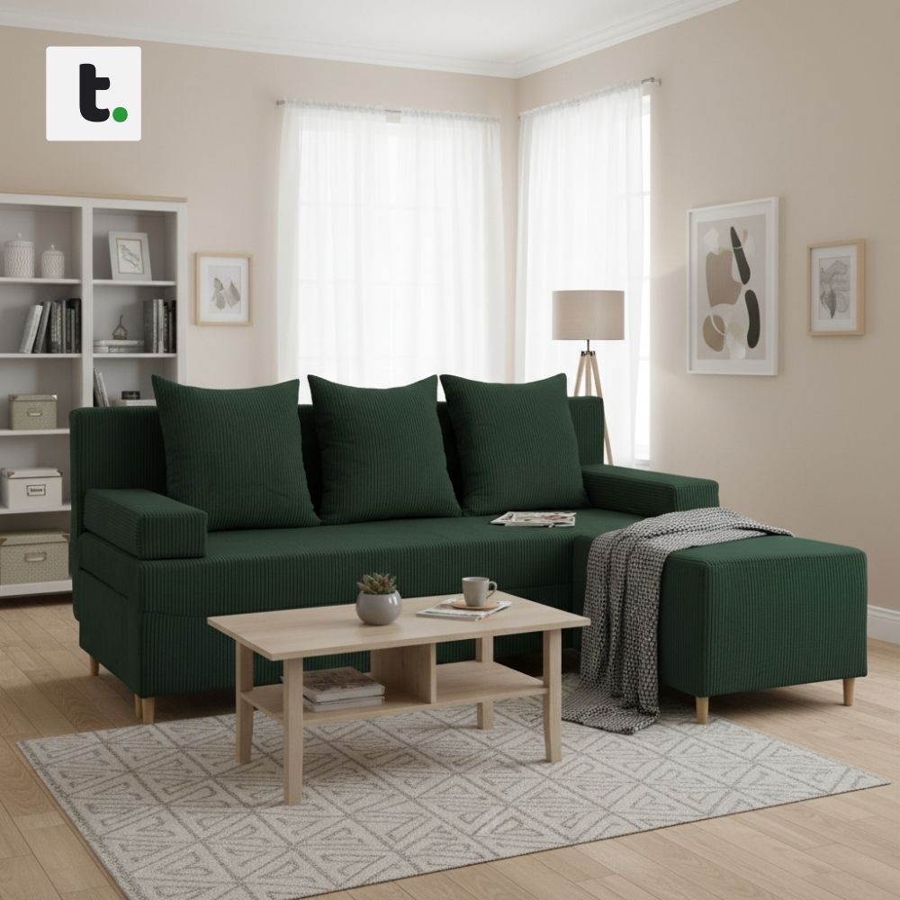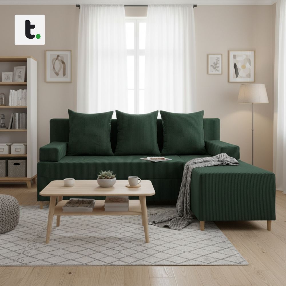 Kanapa z pufą, trzyosobowa, 3w1, sztruks, PANORA, 191x92x92 cm, butelkowa zieleń. PANORA jest komfortowym, nowoczesnym meblem, który ze względu na swoje kompaktowe wymiary sprawdzi się w niewielkim pokoju. W zestawie znajduje się również pufa, która może pełnić rolę podnóżka, a kiedy dostawisz ją do jednego z końców kanapy utworzysz narożnik. Kanapa posiada 3 wygodne poduszki. Każda z nich wyposażona jest w zamek, dzięki czemu możesz w dowolnym momencie zdjąć pokrowiec i go wyprać.