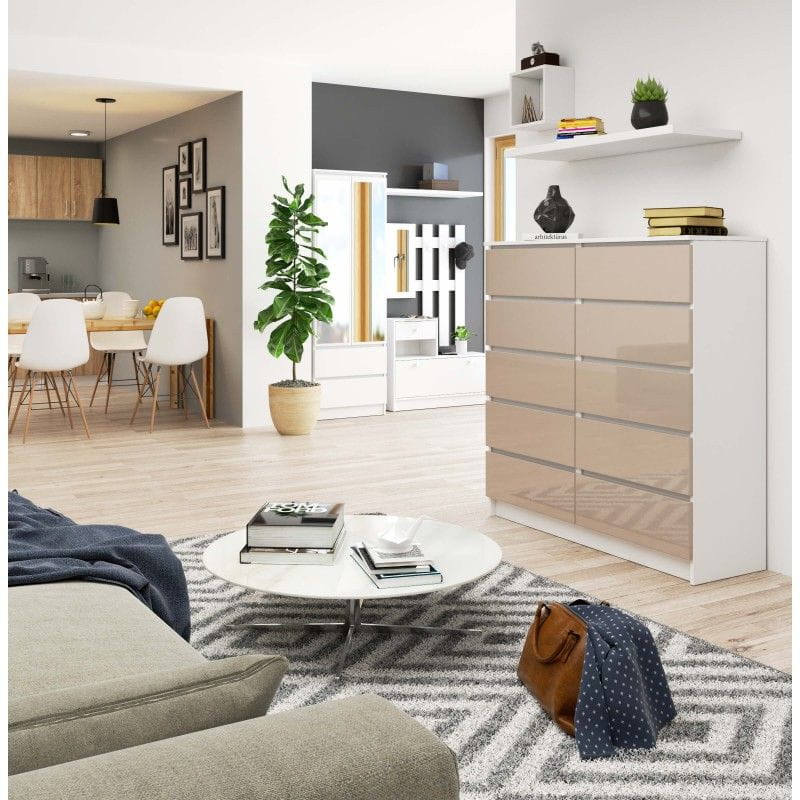 Komoda do salonu, sypialni, STILO, 10 szuflad, 120x40x121 cm, biel, cappuccino, połysk