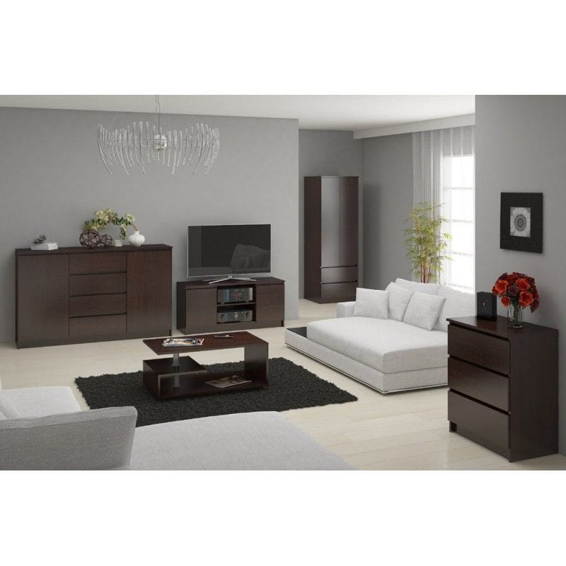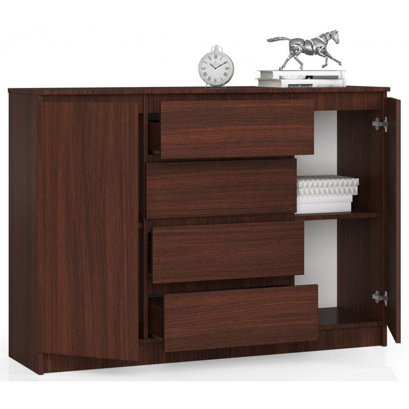 Komoda do sypialni, 4 szuflady, półki, 140 cm. Przepiękna i funkcjonalna - taka właśnie jest komoda K140. Jej gustowny kolor oraz ergonomiczny i estetyczny design sprawiają, że jest to mebel, który doskonale sprawdzi się zarówno w sypialni, jak i salonie czy przedpokoju. Przemyślana budowa komody zapewnia jej dużo miejsca do przechowywania. Dzięki dwóm wyposażonym w półki szafkom i czterem poruszającym się po metalowych prowadnicach rolkowych szufladom pomieści się w niej wiele przedmiotów codziennego użytku, a na przestronnym blacie wspaniale prezentować się będą rodzinne pamiątki, dekoracje czy akcesoria, które warto mieć pod ręką.