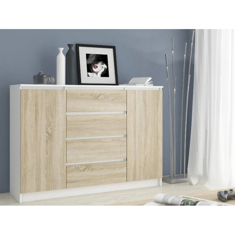 Komoda do sypialni, 4 szuflady, półki, 160 cm. Przepiękna i funkcjonalna - taka właśnie jest komoda K140. Jej gustowny kolor oraz ergonomiczny i estetyczny design sprawiają, że jest to mebel, który doskonale sprawdzi się zarówno w sypialni, jak i salonie czy przedpokoju. Przemyślana budowa komody zapewnia jej dużo miejsca do przechowywania. Dzięki dwóm wyposażonym w półki szafkom i czterem poruszającym się po metalowych prowadnicach rolkowych szufladom pomieści się w niej wiele przedmiotów codziennego użytku, a na przestronnym blacie wspaniale prezentować się będą rodzinne pamiątki, dekoracje czy akcesoria, które warto mieć pod ręką.
