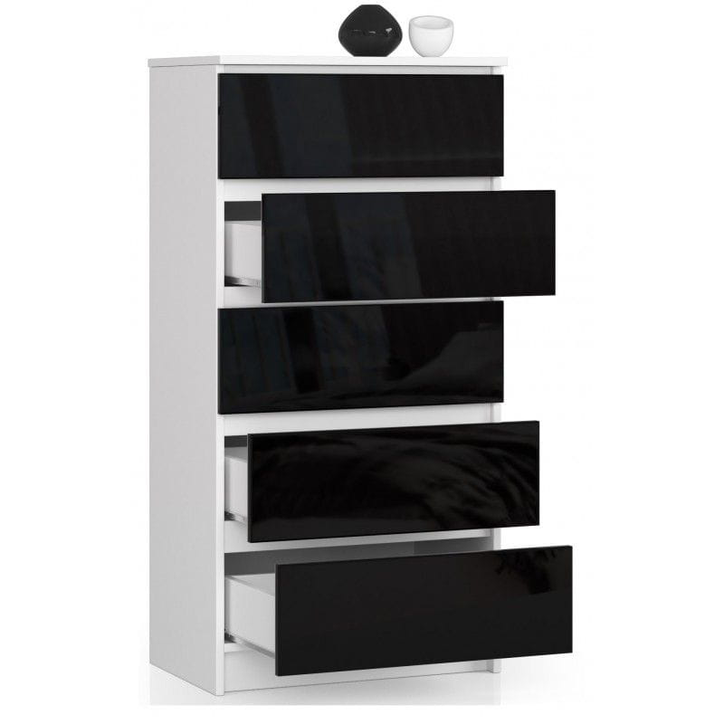 Komoda do sypialni, 5 szuflad, STILO, 60x40x121 cm, biel, czarny, połysk