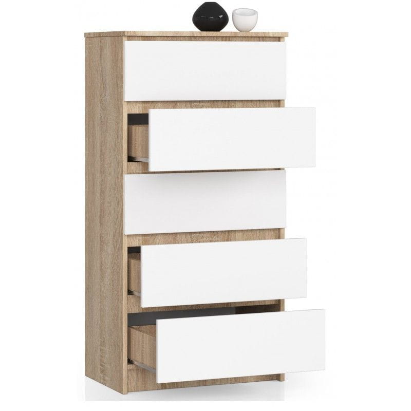 Komoda do sypialni, 5 szuflad, STILO, 60x40x121 cm, dąb sonoma, biel, mat