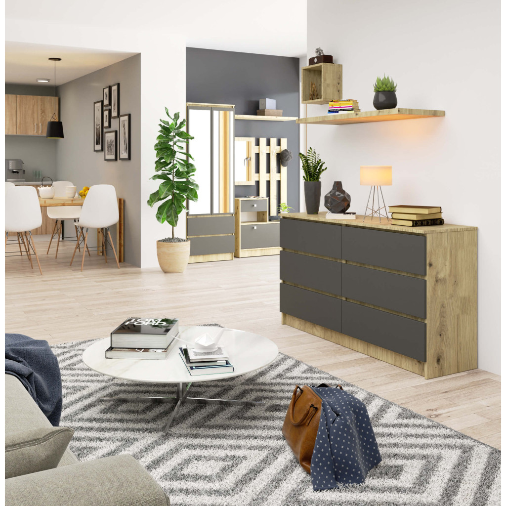 Komoda do sypialni, 6 szuflad, STILO, 140x40x77 cm, dąb artisan, grafit szary, mat