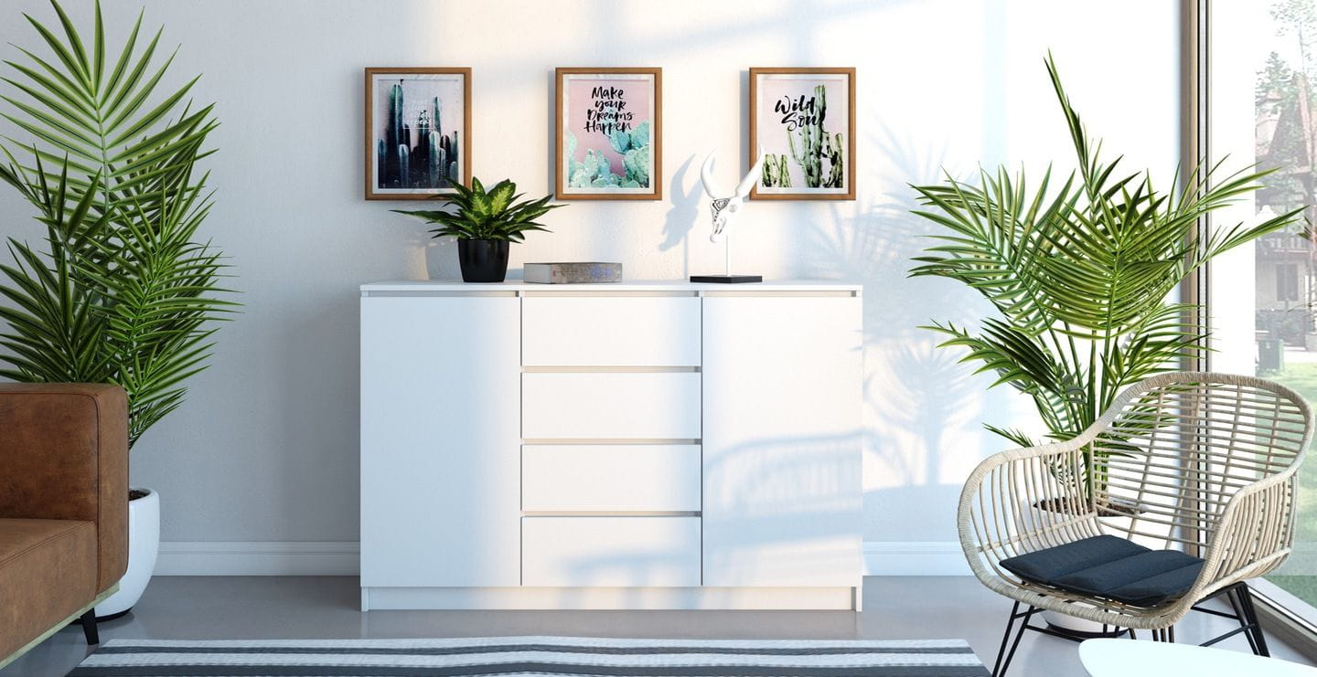 - Wnętrze komody składa się z półek oraz czterech szuflad, które pomogą przy rozmieszczaniu rzeczy. Łatwiej będzie znaleźć to, czego się szuka.