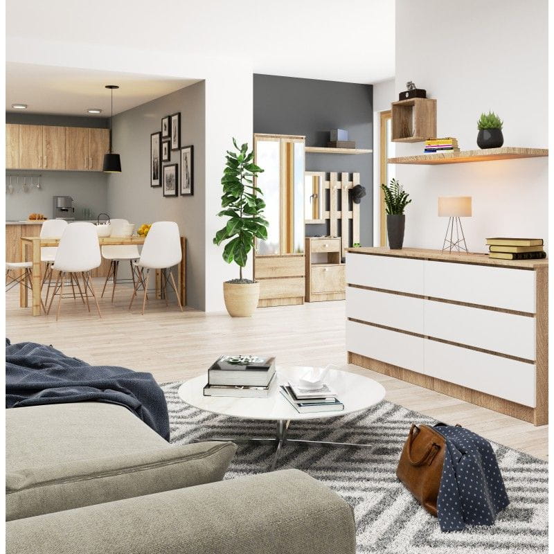 Komoda do sypialni, STILO, 6 szuflad, 160x40x77 cm, dąb sonoma, biel, mat