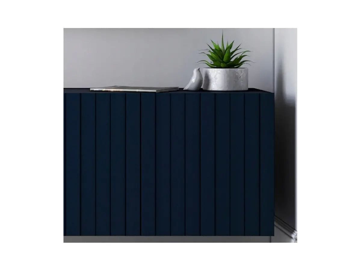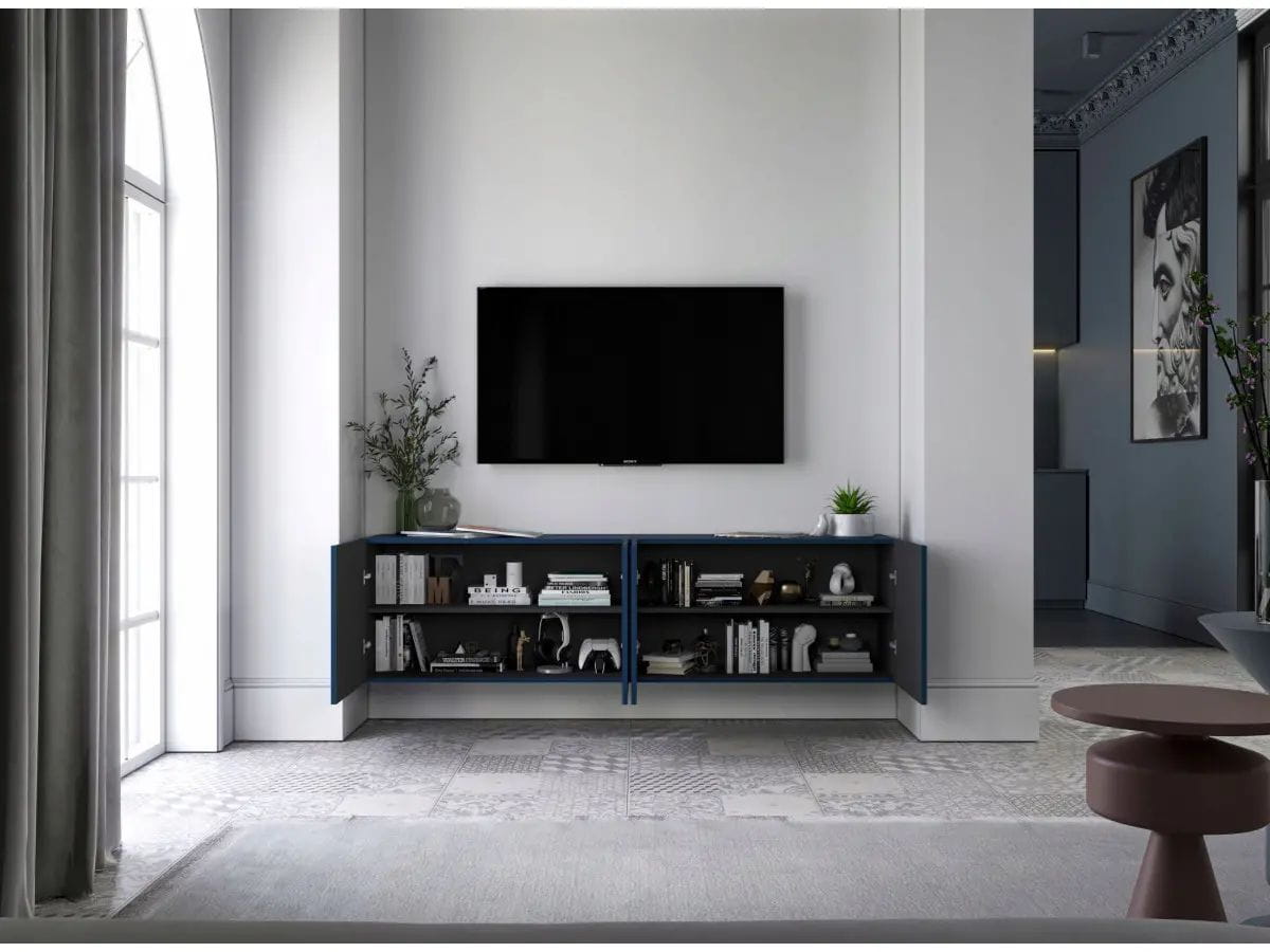 Komoda RTV, szafka wisząca, glamour, Elpis, 150x37x39 cm, granatowy, mat. Szafka pod telewizor, która doda każdemu wnętrzu niepowtarzalnej elegancji oraz zapewni jej użytkownikom wiele miejsca do wygodnego przechowywania. Swoją funkcjonalnością zadowoli nawet najbardziej wymagających. System "push to open" do otwierania drzwiczek gwarantuje estetyczny wygląd komody RTV ze względu na brak widocznych uchwytów, zaś metalowe zawiasy meblowe z regulacją pozwalają na dostosowanie przestrzeni do indywidualnych potrzeb.