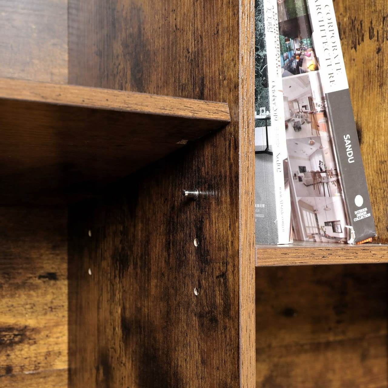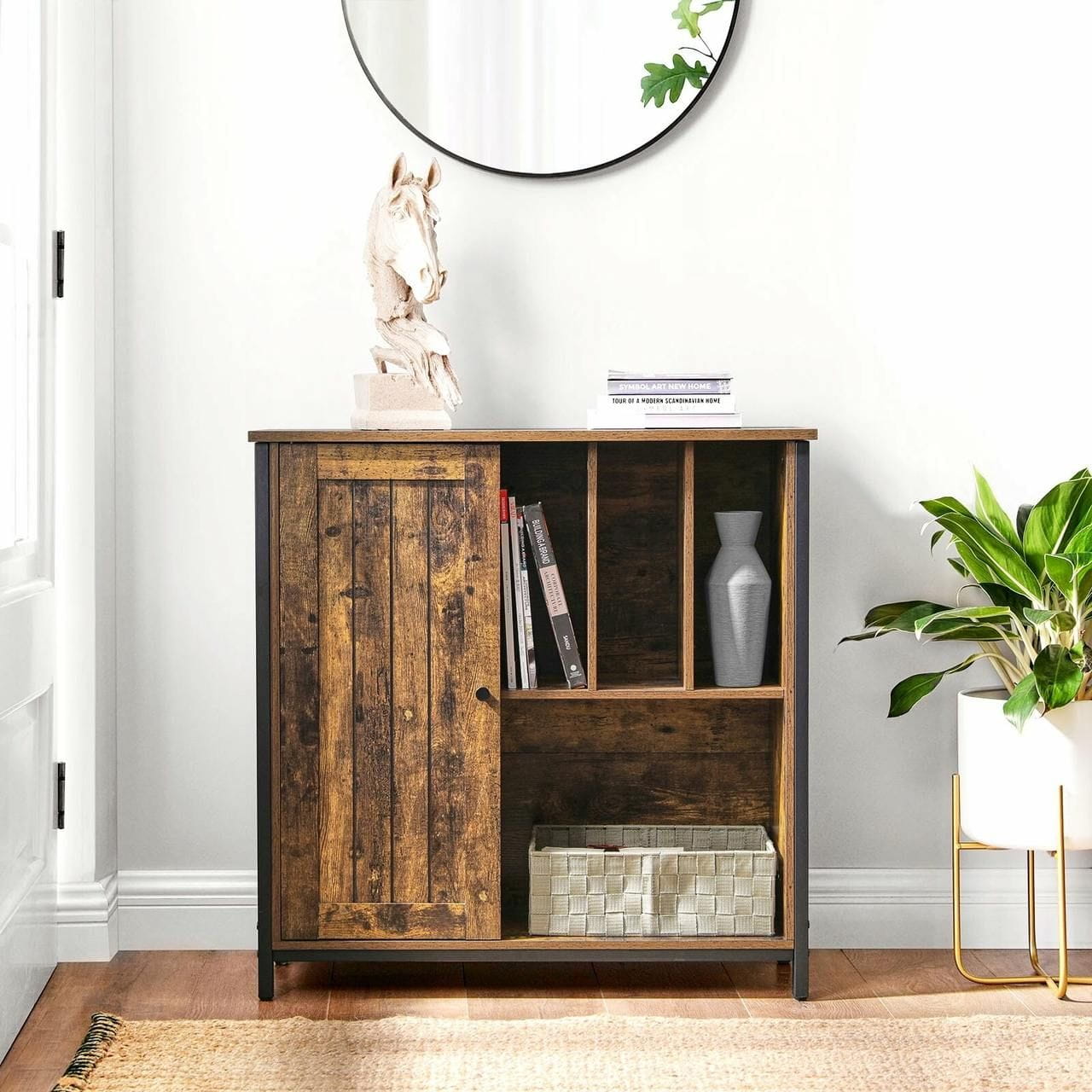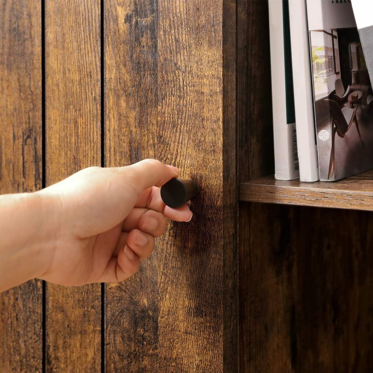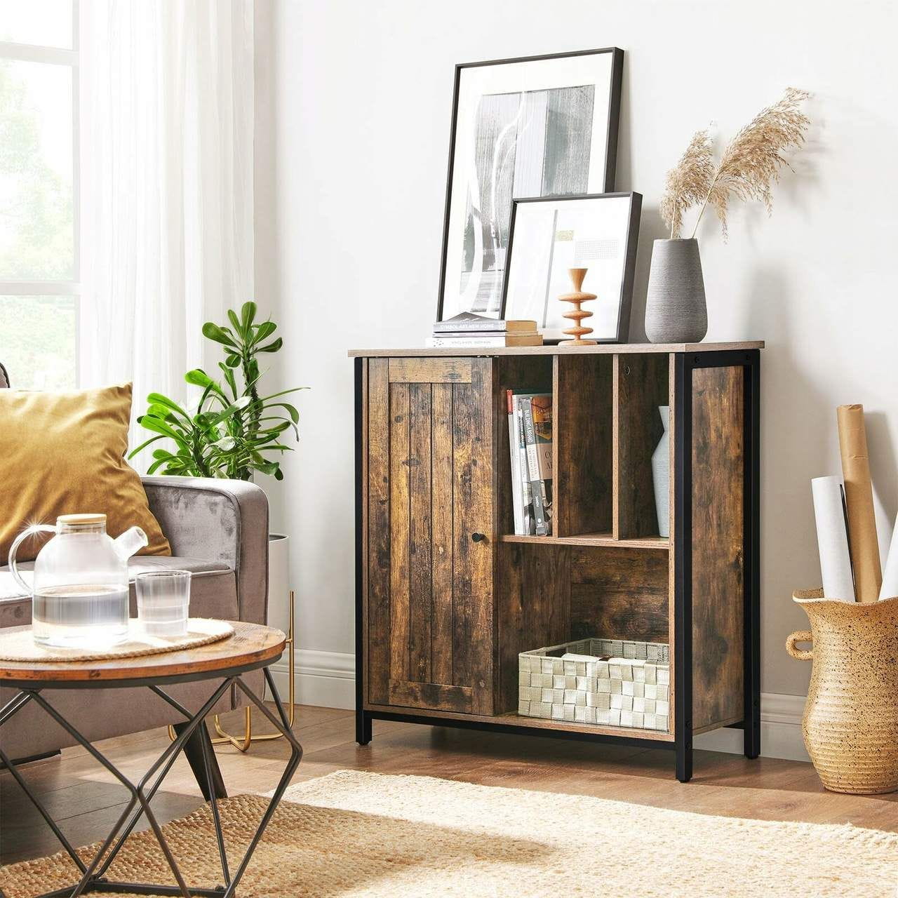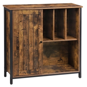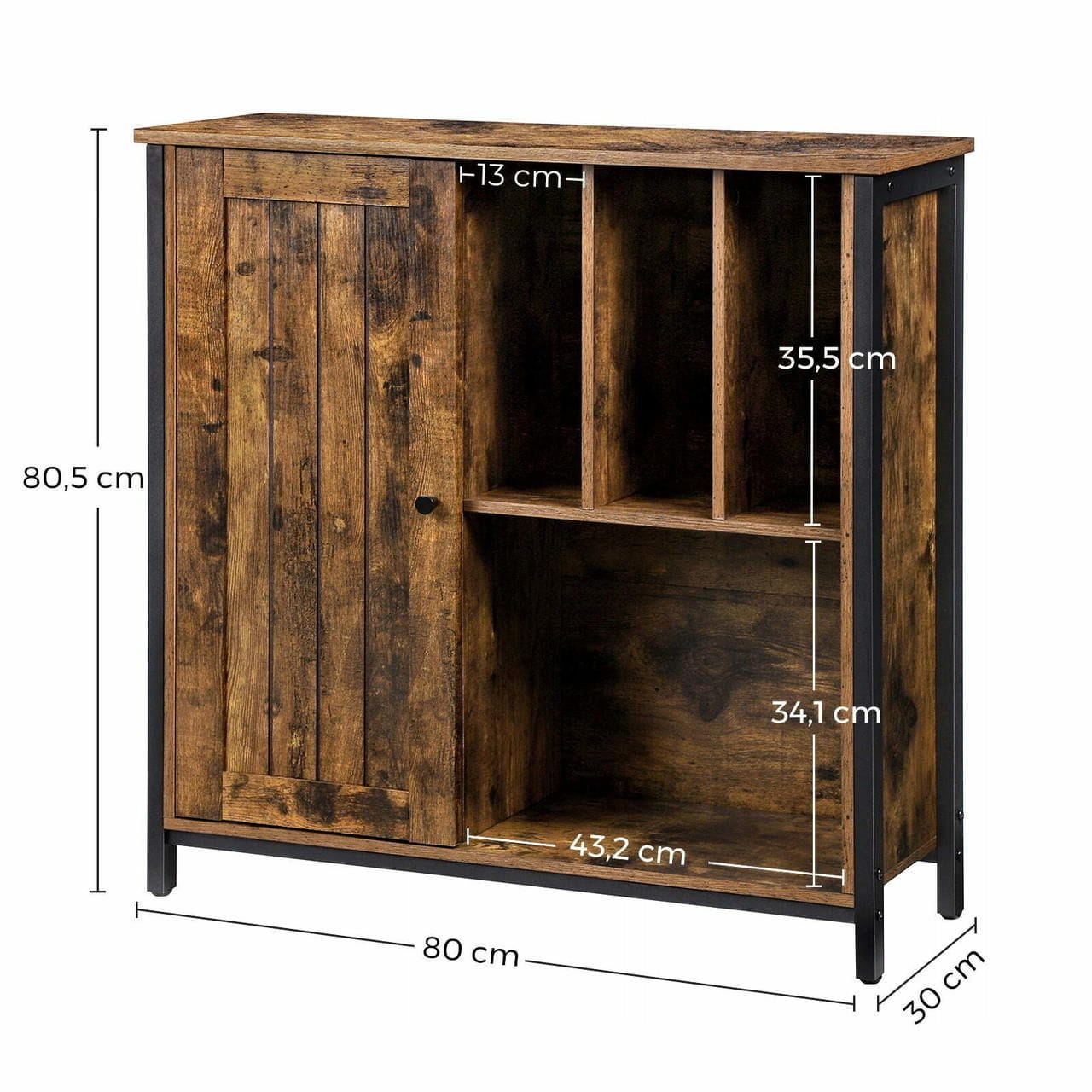 Komoda rustykalna do salonu, sypialni, 80x30x80 cm, ciemny brąz, czarny, mat. Prosty oraz estetyczny mebel do wykorzystania w pokoju, biurze czy korytarzu. Gdziekolwiek umieścisz szafkę, trzy otwarte półki oraz zamknięte przegrody sprostają Twoim oczekiwaniom.