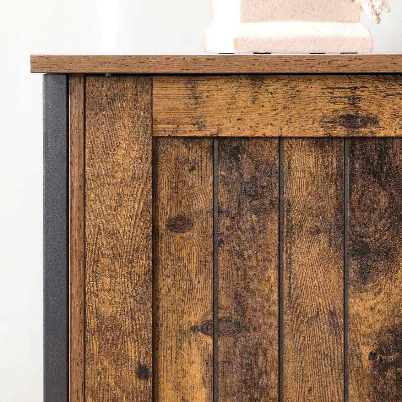 Elementy o fakturze drewna nadają szafce uroku w stylu vintage i retro. Konstrukcja wykonana ze stali jest stabilna i wytrzymała. Regulowane nóżki ułatwią wypoziomowanie mebla na nierównej podłodze