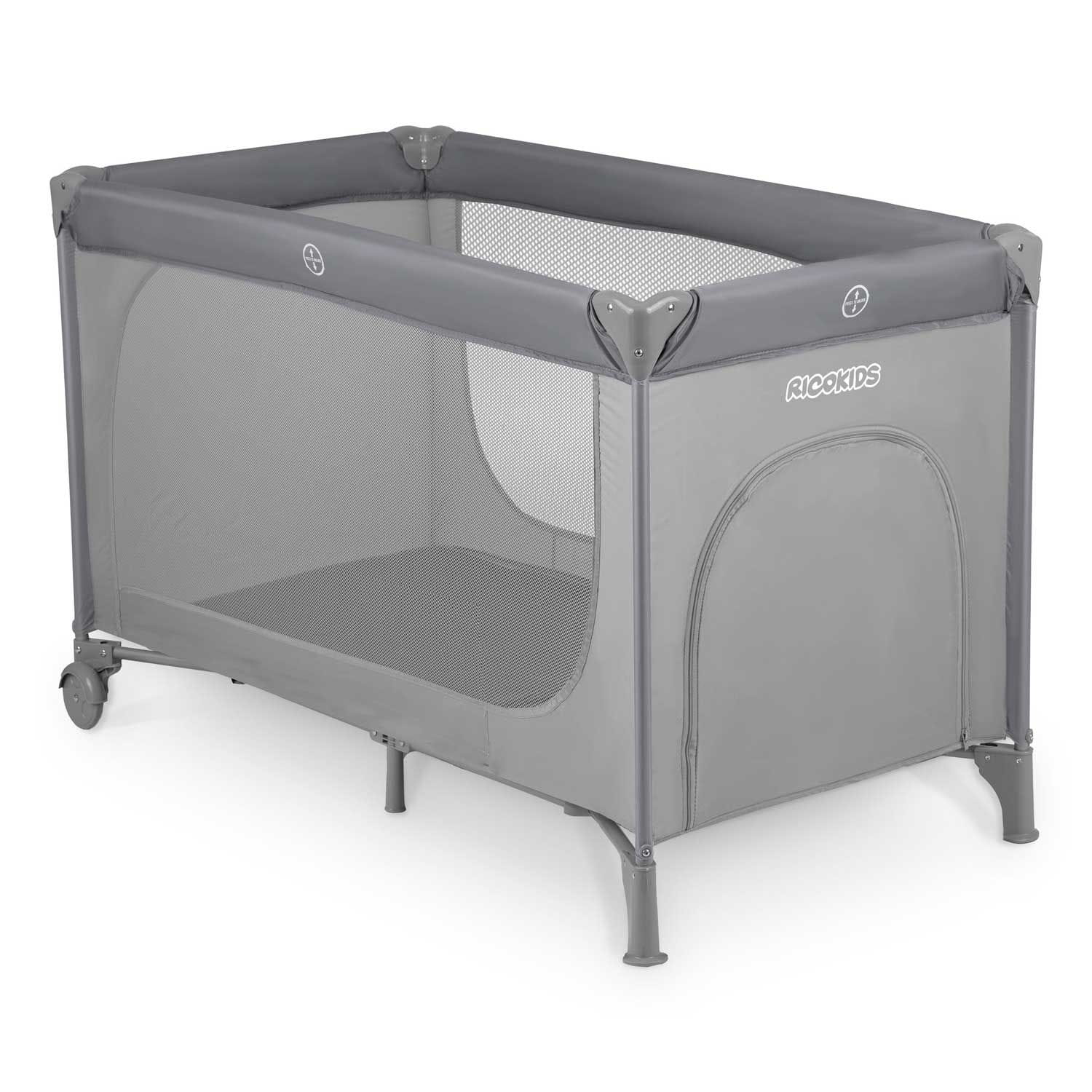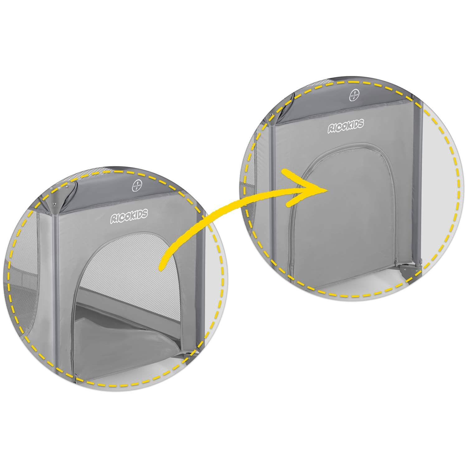 Odpinane wejście boczne jest nie do sforsowania przez małe dzieci, dzięki zamkowi wszytemu od zewnętrznej strony. Natomiast starszym już, sprawniejszym i bardziej ruchliwym umożliwia ono samodzielne, wygodne i bezpieczne wchodzenie oraz wychodzenie z łóżeczka - dzięki temu nie będą próbowały wspinać się na górną krawędź. Sposób wszycia siatki pozwala uniknąć nadmiernych napięć i zwiększa jej wytrzymałość.
