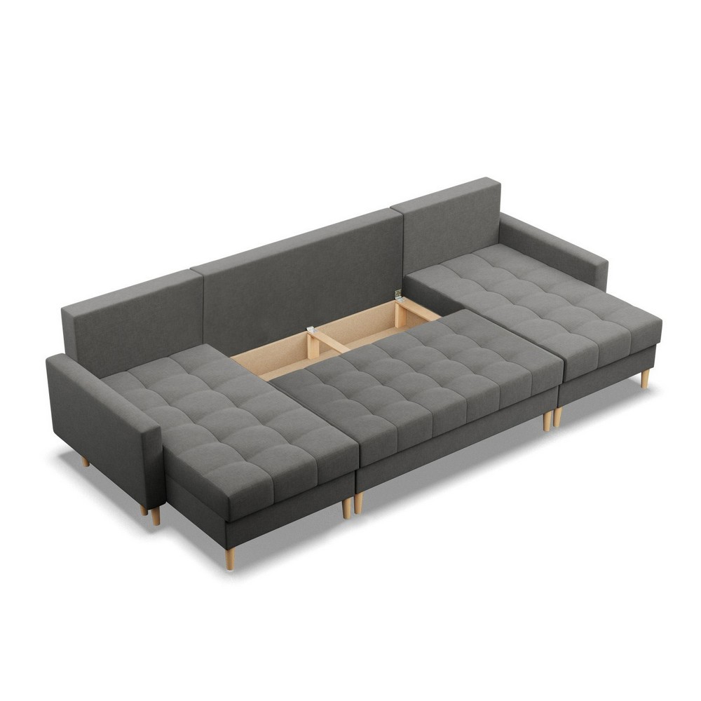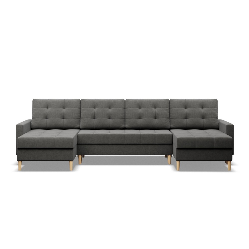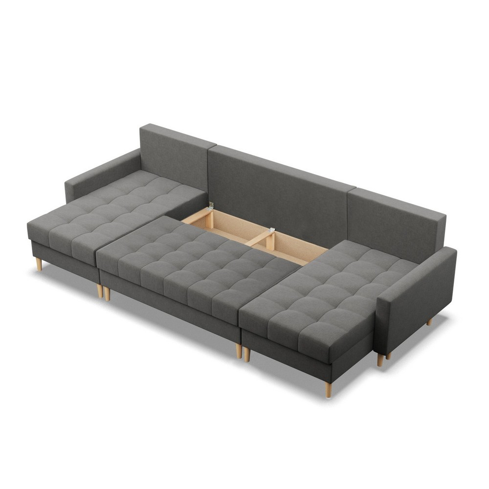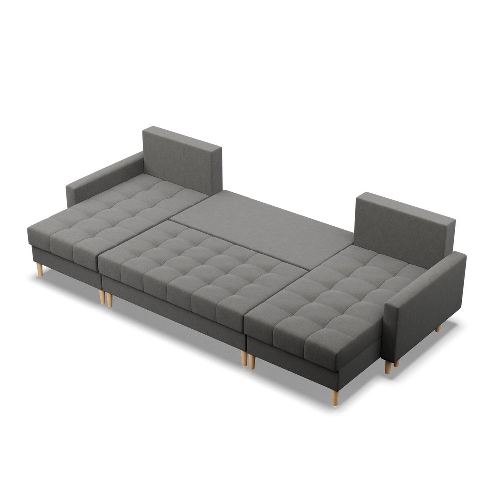 Narożnik w kształcie litery U - NOBU, wykonany w tkaninie o ciemnoszarej kolorystyce, o wymiarach 294x140x92 cm, to propozycja łącząca nowoczesny design z funkcjonalnością. Jeśli szukasz mebla o minimalistycznej formie, który w kilka chwil zmieni się w wygodne miejsce do spania, NOBU będzie idealnym wyborem.