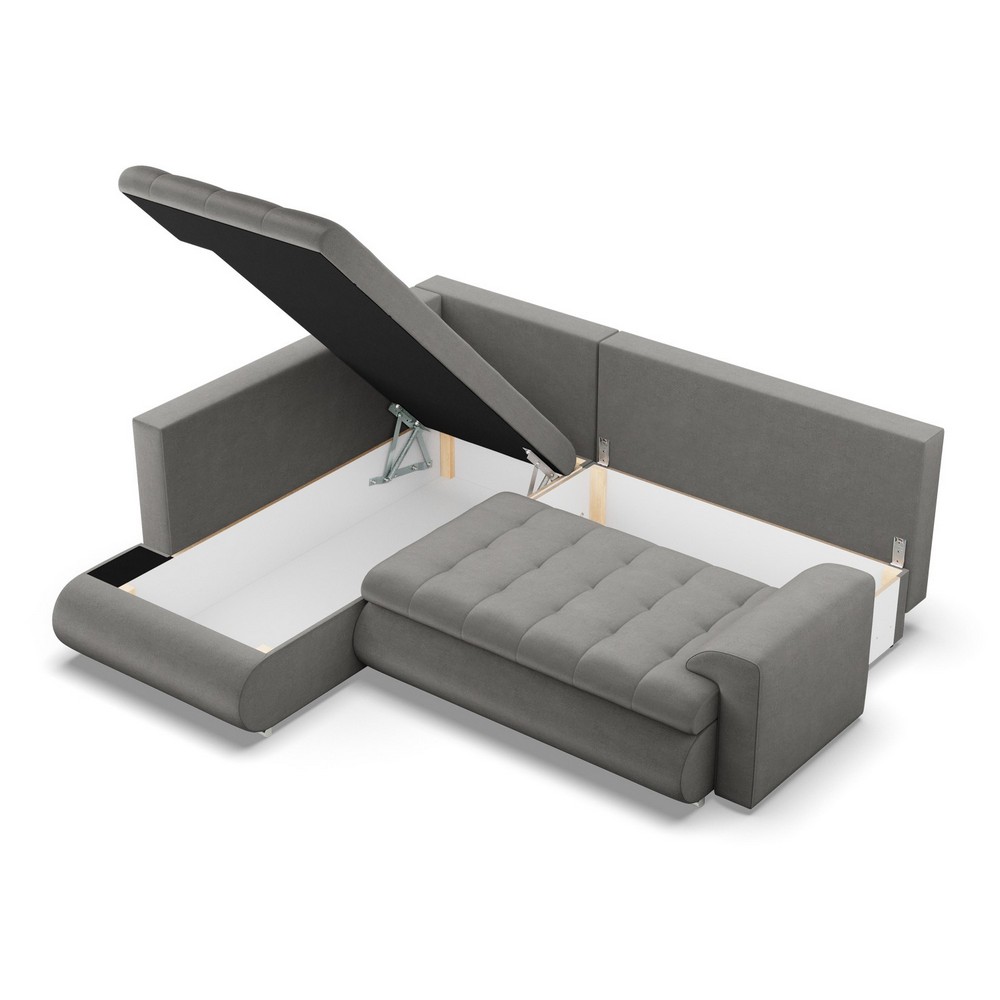 Rogówka BOSCO została wyposażona w wygodną funkcję spania opartą na mechanizmie DL. Wystarczy unieść siedzisko i przesunąć je do przodu, a następnie ułożyć oparcie w powstałej przestrzeni. Dzięki temu w kilka chwil zamienisz narożnik w pełnowymiarowe łóżko o powierzchni 200 × 140 cm. Na uwagę zasługuje także duża pojemność - narożnik posiada nie jeden, a dwa praktyczne schowki na pościel, dzięki czemu z łatwością uporządkujesz tekstylia i zyskasz dodatkowe miejsce do przechowywania.