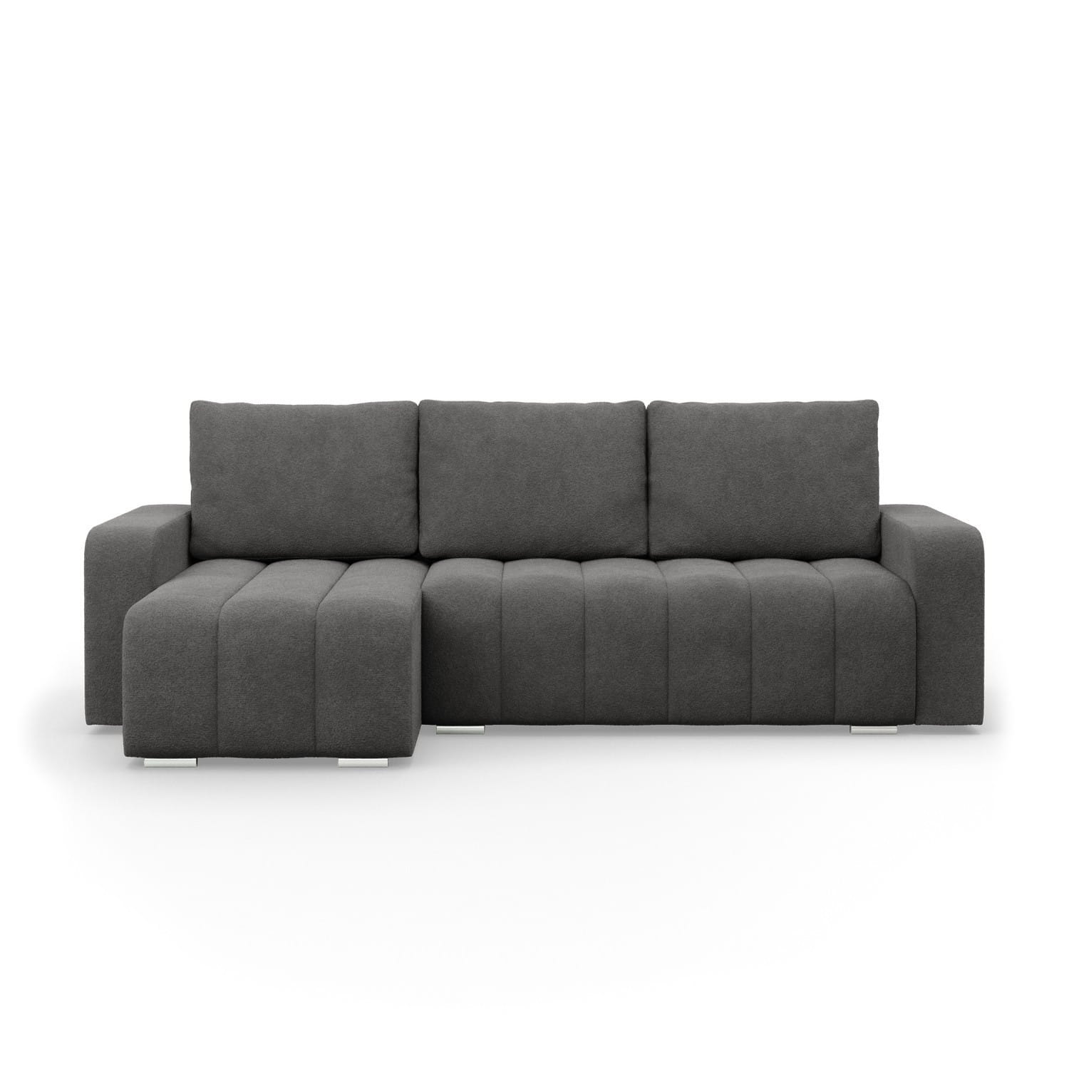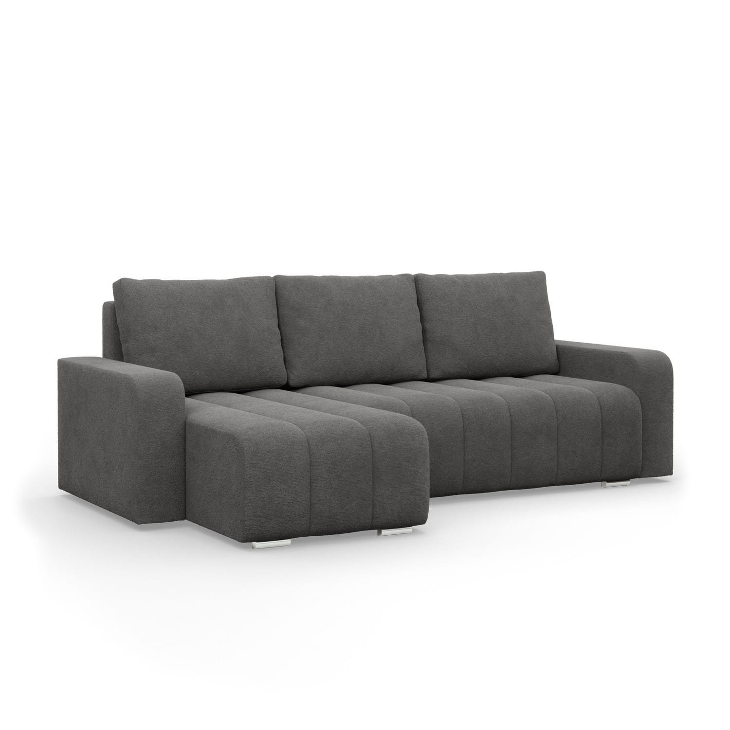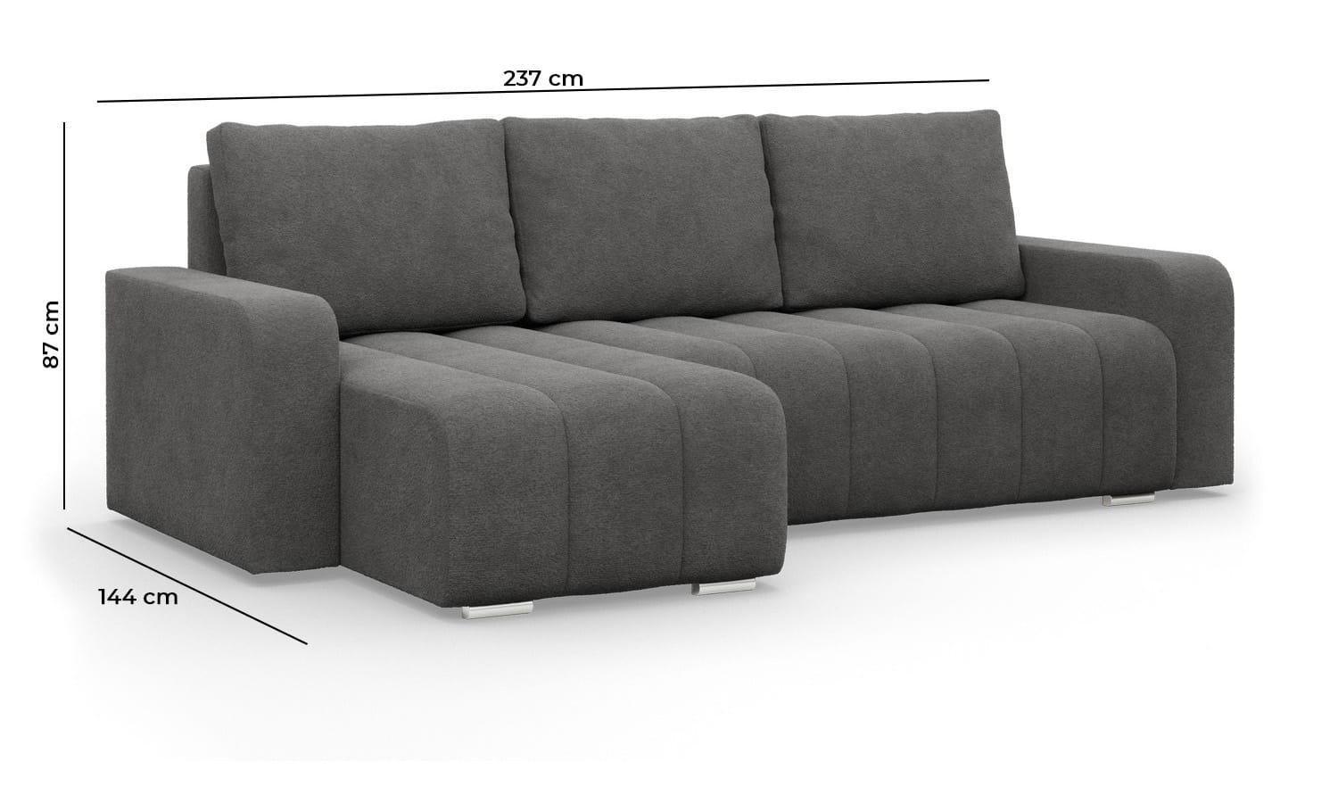 Narożnik z poduszkami, Velluto, 237x144x87 cm, ciemny szary. Zadbaj o kącik wypoczynkowy z komfortowym narożnikiem VELLUTO! Nowoczesny narożnik z funkcją spania świetnie sprawdzi się w dużym salonie lub pokoju dziennym, oszałamiając swoją estetyką. Klasyczna forma narożnika połączona z funkcjonalnymi rozwiązaniami technologicznymi w postaci podłokietników, luźnych poduszek i pojemnika na pościel będzie idealną ozdobą i jednocześnie miejscem spotkań z rodziną i przyjaciółmi.