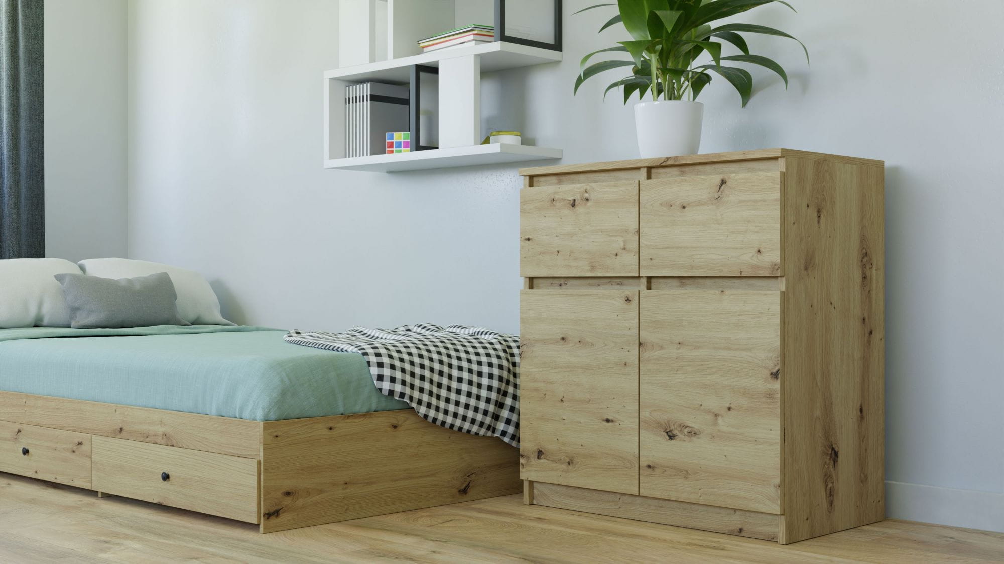 Wnętrze komody składa się z półek oraz dwóch szuflad, które pomogą przy rozmieszczaniu rzeczy. Spodnie, podkoszulki, bluzy, bielizna, a może pościel? Łatwiej będzie znaleźć to, czego się szuka.