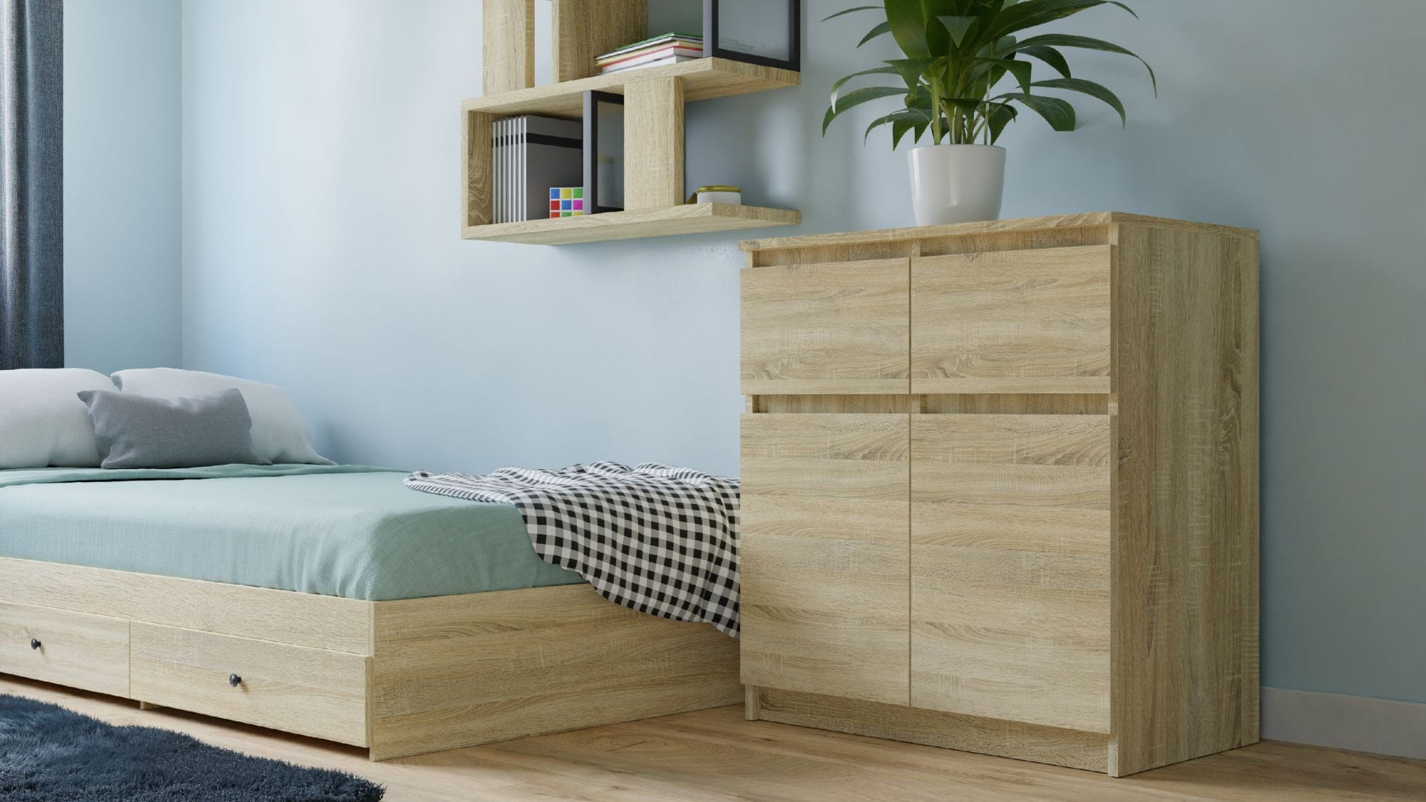 Wnętrze komody składa się z półek oraz dwóch szuflad, które pomogą przy rozmieszczaniu rzeczy. Spodnie, podkoszulki, bluzy, bielizna, a może pościel? Łatwiej będzie znaleźć to, czego się szuka.