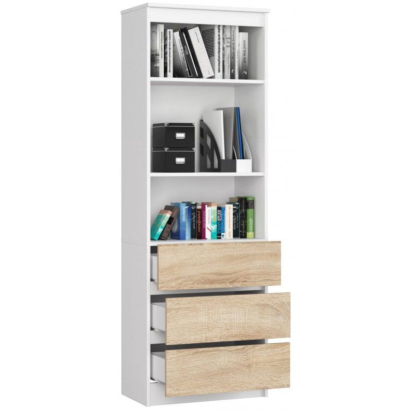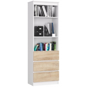 Regał do salonu, 3 szuflady, półki, ARLO, 60x35x180 cm, biały, dąb sonoma, mat
