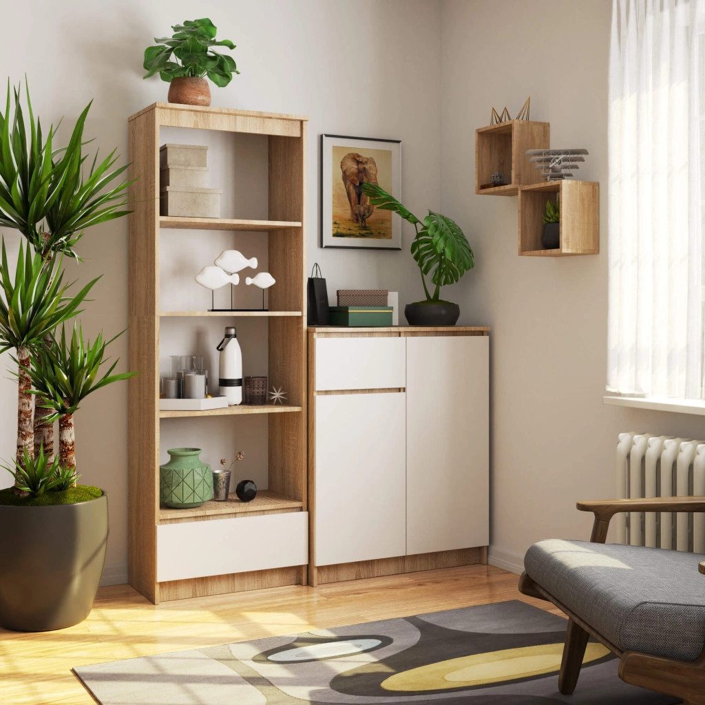Regał do salonu, biura, 1 szuflada, półki, ARLO, 60x35x180 cm, dąb sonoma, biały, mat