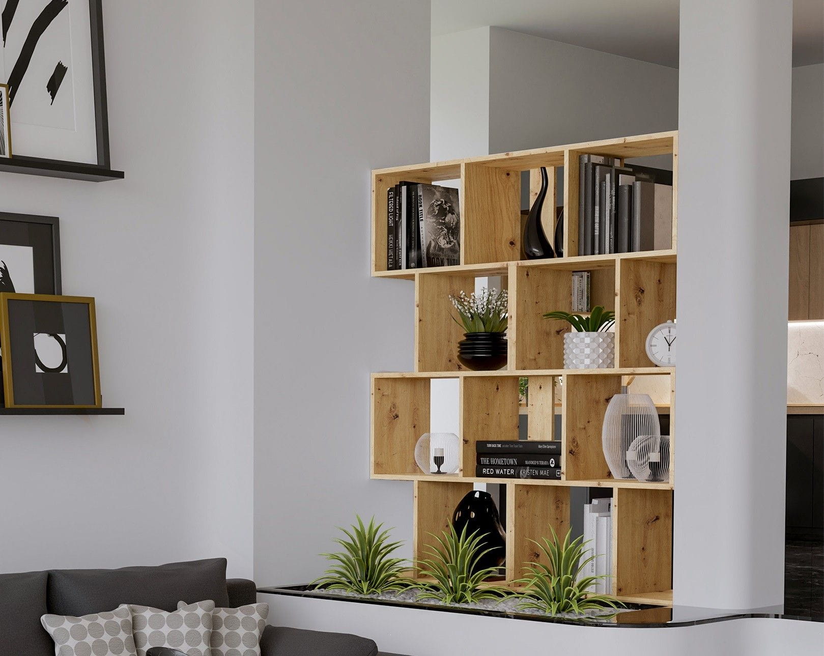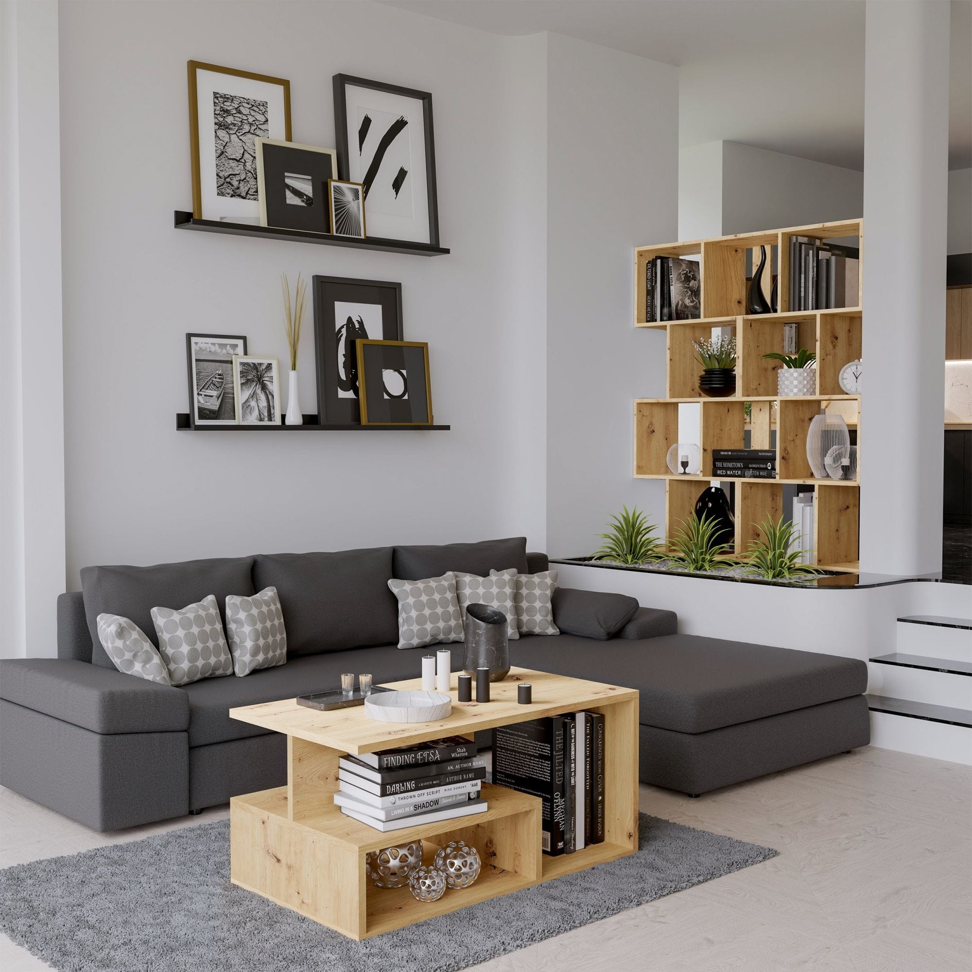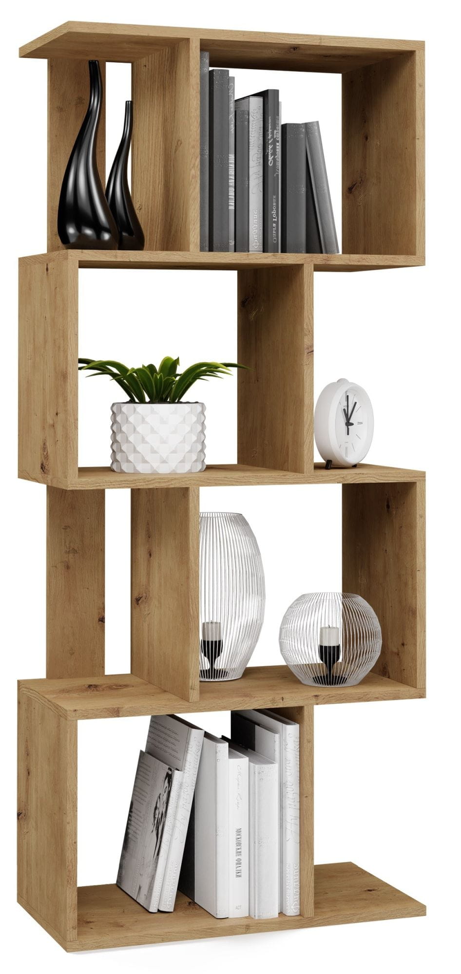 Regał stojący, półka, szafka, Fiesta 4P, 59,5x30x140 cm, dąb artisan mat. Nowoczesny otwarty modułowy regał na książki, segregatory, zabawki i gadżety. Mebel powstał w oparciu o zastosowanie mocnej i solidnej płyty laminowanej.