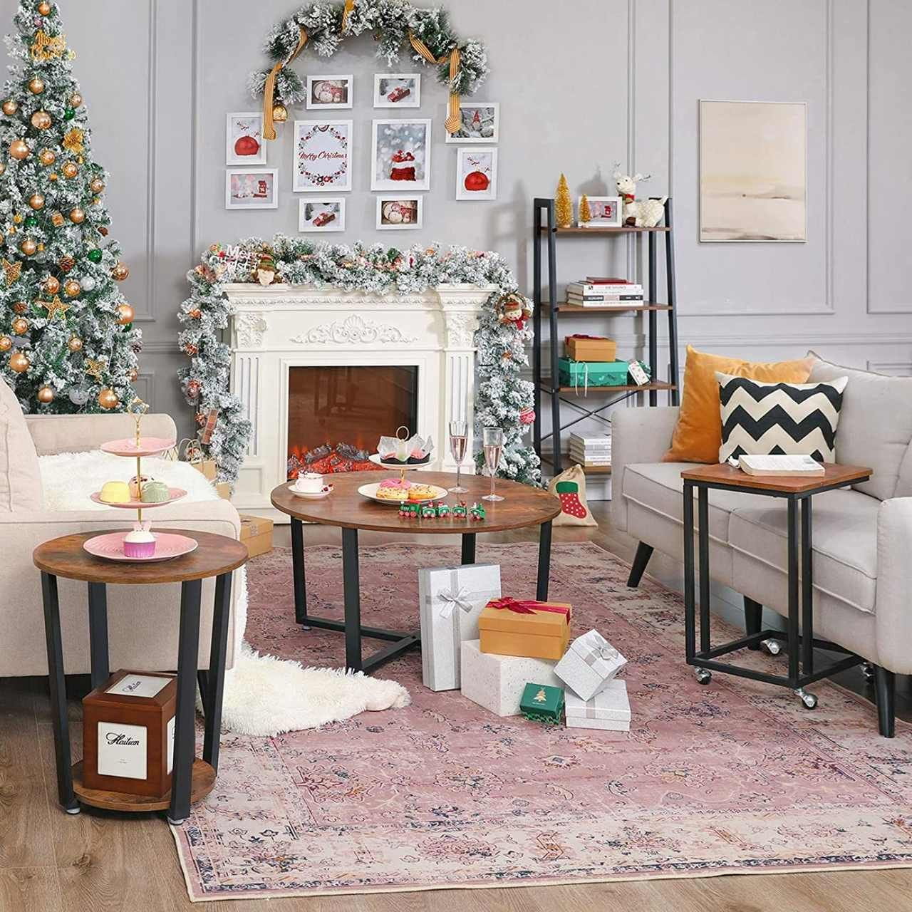 Stolik kawowy okrągły, 88x88x47 cm, ciemny brąz, czarny, mat. Unikalny wygląd w rustykalnym stylu. Stolik idealnie posłuży do grania w gry planszowe, wypicia kawy czy postawienia przekąsek. Składa się z tylko trzech elementów, dzięki czemu złożenie go zajmie tylko chwilę. Do wykorzystania w pokoju, biurze czy innym pomieszczeniu. Skrzyżowane metalowe nogi w kolorze matowej czerni oraz okrągły blat stołu o fakturze drewna, wniosą powiew świeżości do każdego pokoju.