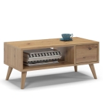 Nóżki z drewna dębowego lakierowane o wysokości 15 cm. Stolik posiada szufladę z nowoczesnym systemem CLIK. Jak on działa? Jeżeli chcesz otworzyć swoją szufladę czy półkę wystarczy niewielką siłą nacisnąć w górnym rogu danej szuflady czy półki. Zapomnij o uchwytach, twoje szafki czy szuflady będą zawsze domknięte, a przy otwieraniu zachowasz pełny komfort.
