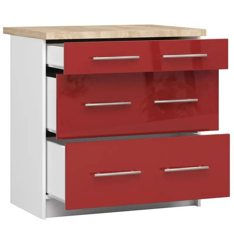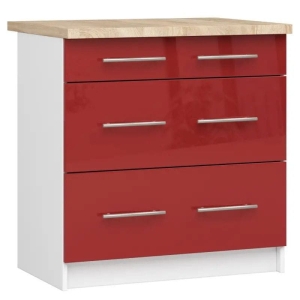 Szafka kuchenna z blatem, KLARA, 80x60x85 cm, biały, czerwony, połysk. Szafka składająca się z trzech szuflad na pewno bardzo dobrze sprawdzi się w każdej kuchni, zapewniając dużo miejsca na przechowywanie najpotrzebniejszych rzeczy sztućców, naczyń, a także środków czystości i artykułów spożywczych.