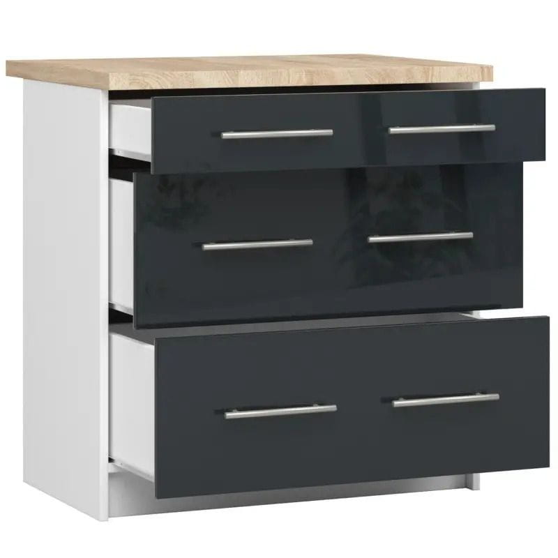 Szafka kuchenna z blatem, KLARA, 80x60x85 cm, biały, grafit, połysk. Szafka składająca się z trzech szuflad na pewno bardzo dobrze sprawdzi się w każdej kuchni, zapewniając dużo miejsca na przechowywanie najpotrzebniejszych rzeczy sztućców, naczyń, a także środków czystości i artykułów spożywczych.