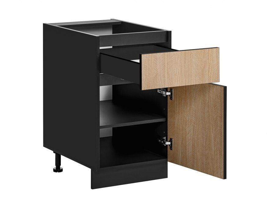 Szafka kuchenna z szufladą, Roma, 60x45x81 cm, czarny, jodełka, mat. Funkcjonalna szafka kuchenna, która pozwala zagospodarować nawet najmniejszą przestrzeń. W organizacji przechowywania pomoże Ci szuflada i głębokie półki, w których możesz umieścić różne elementy wyposażenia kuchni. Dedykowana szafka doskonale prezentuje się również jako uzupełnienie innych mebli kuchennych. Dobierz do niej pozostałe szafki z kolekcji ROMA i stwórz piękną i funkcjonalną kuchnię!