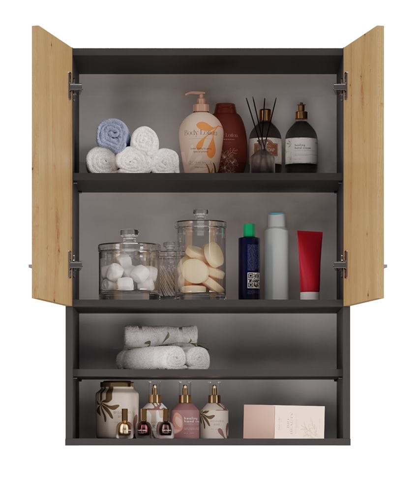 Szafka łazienkowa nad pralkę, Pola mini, 64x30x90 cm, antracyt, dąb artisan, mat. Funkcjonalna szafka, która pozwala zagospodarować nawet najmniejszą przestrzeń. Półka wisząca posiada 4 półki, na których możesz umieścić wszystkie potrzebne akcesoria. Dla komfortu użytkowania POLA MINI został wyposażona również w nowy rodzaj okuć bez zaślepek. Dzięki uniwersalnej kolorystyce idealnie sprawdzi się w każdej nowoczesnej łazience.
