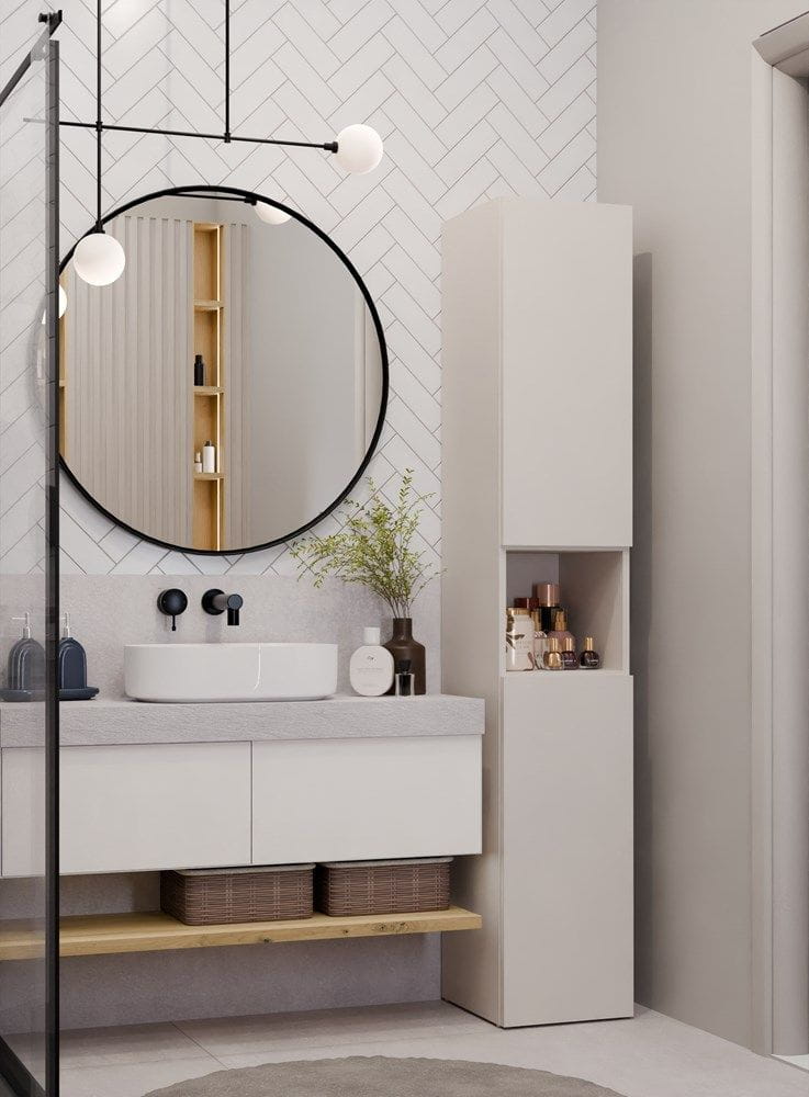 Szafka łazienkowa, regał, słupek, Nel III, 31x30x174 cm, beżowy, mat. W każdej łazience znajdą się rzeczy, które potrzebują swojego miejsca. Dzięki praktycznym słupkom, skutecznie zapanujesz nad bałaganem, nie zajmując zbyt wiele przestrzeni.